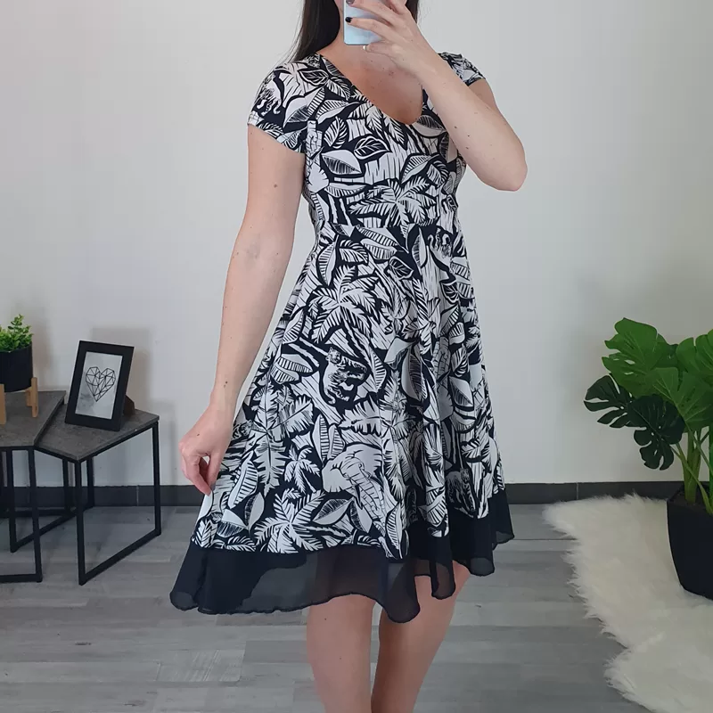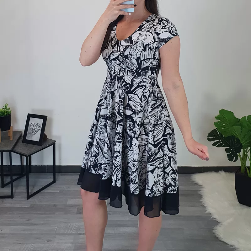 Modna ženska obleka Dafne v kombinaciji modre in bele barve. Obleka ima kratka rokava in ovratnik na ‘V’. V predelu prsi je oprijeta nato pa krojena navzven – za lepši izgled je na koncu dodan še temno moder til. Izdelana je iz kvalitetne viskoze, je lahka in zračna.