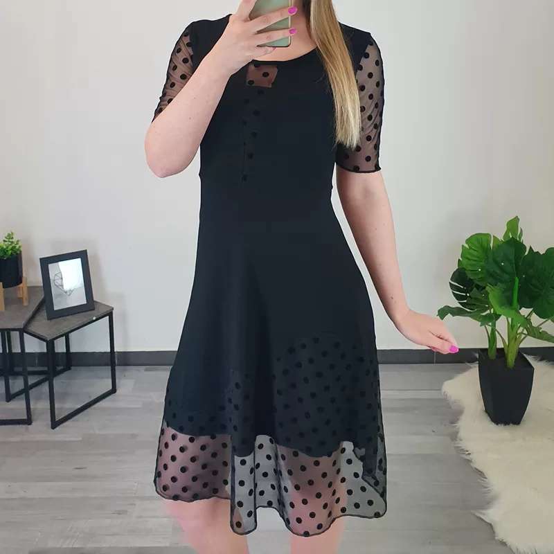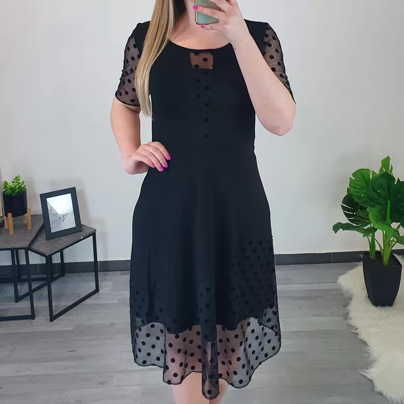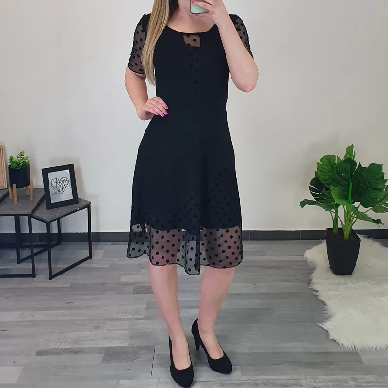 Ženska obleka Dejka v črni barvi. Obleka ima kratka rokava narejena iz črnega tila s pikami, enak material je dodan tudi na spodnjem delu obleke in ob izrezu. Narejena je iz viskoze, primerna je za vroče dni saj je material zračen. V prsih je oprijeta, v pasu pa se začne širiti. Obleka je krojena od velikosti 36 do 46.