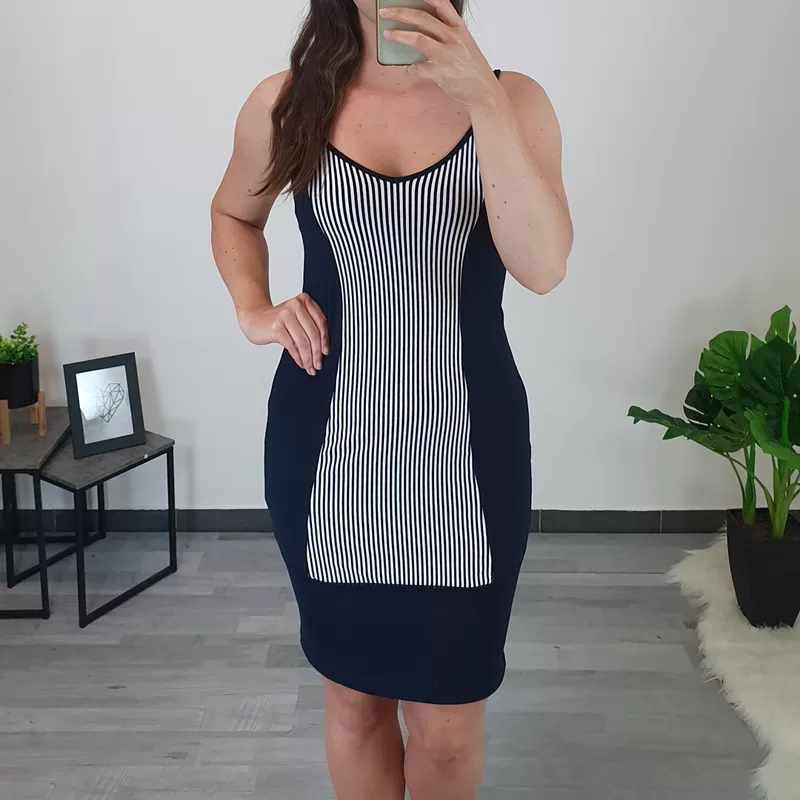 Poletna bombažna obleka Heda v temno modri barvi. Obleka je brez rokav, naramnice so ozke. Kroj obleke je oprijet, na sprednji in zadnji strani je kombinirana z blagom z belimi in temno modrimi črtami. Obleka je odlična izbira za vroče poletne dni. Na voljo je od številke 36 do 48.