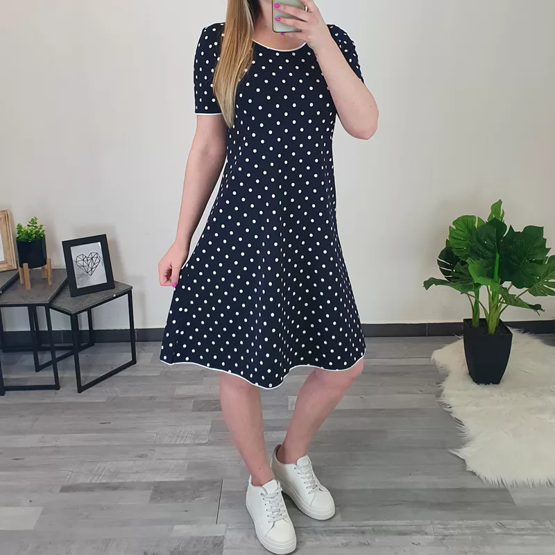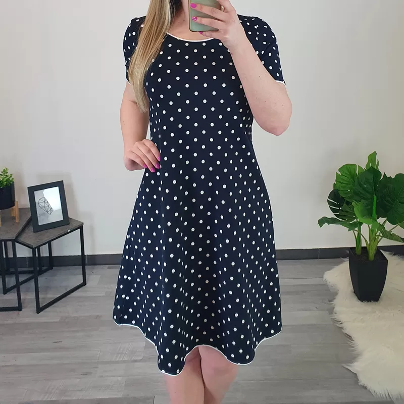 Ženska poletna obleka Joži v temno modri barvi z belimi pikami. Obleka ima kratka rokava, na koncu rokavov, ob vratu in na spodnjem delu je dodan bel trak. Narejena je iz tanjšega bombaža, primerna za poletne dni. Obleka je krojena od velikosti 38 do 44.