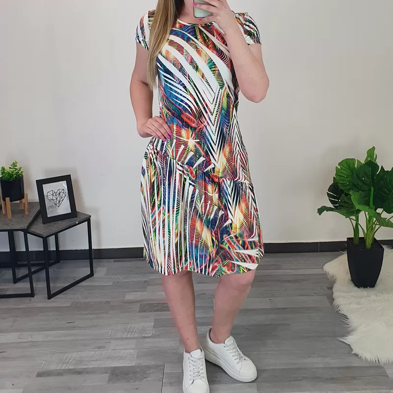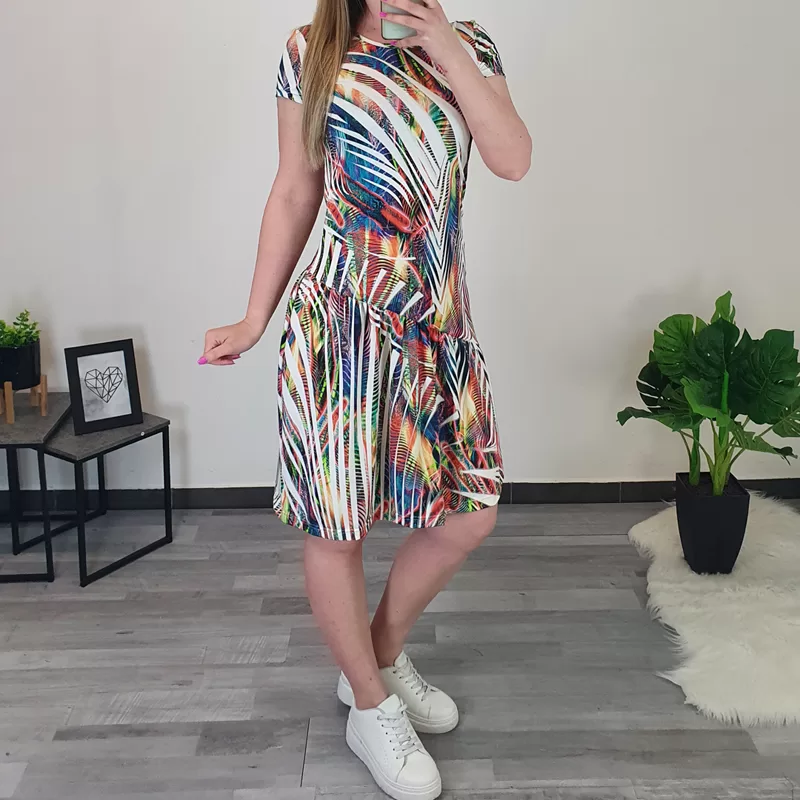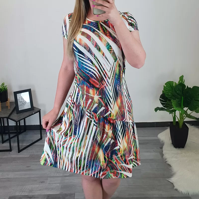 Modna ženska obleka Julka v bež barvi. Celotno obleko krasijo črte v pisanih barvah. Ima kratka rokava in krilo do kolen. Izdelana je iz kvalitetne viskoze, ki lepo pada po telesu. Na voljo je od številke 36 do 46.