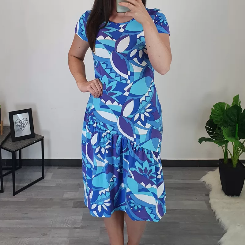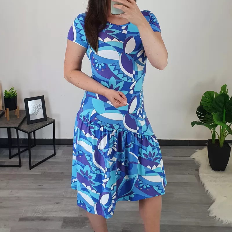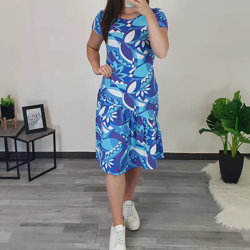 Modna ženska obleka Julka v kombinaciji modre, vijolične in bele barve. Celotno obleko krasijo cvetlični vzorci, kar ji daje zanimiv izgled. Ima kratka rokava in krilo do kolen. Izdelana je iz kvalitetne viskoze, ki lepo pada po telesu. Na voljo je od številke 36 do 46.