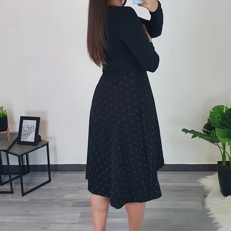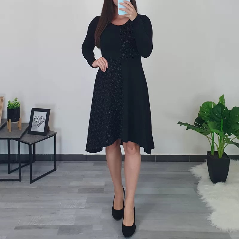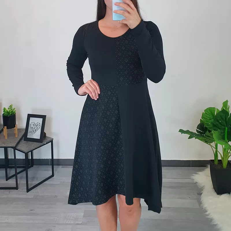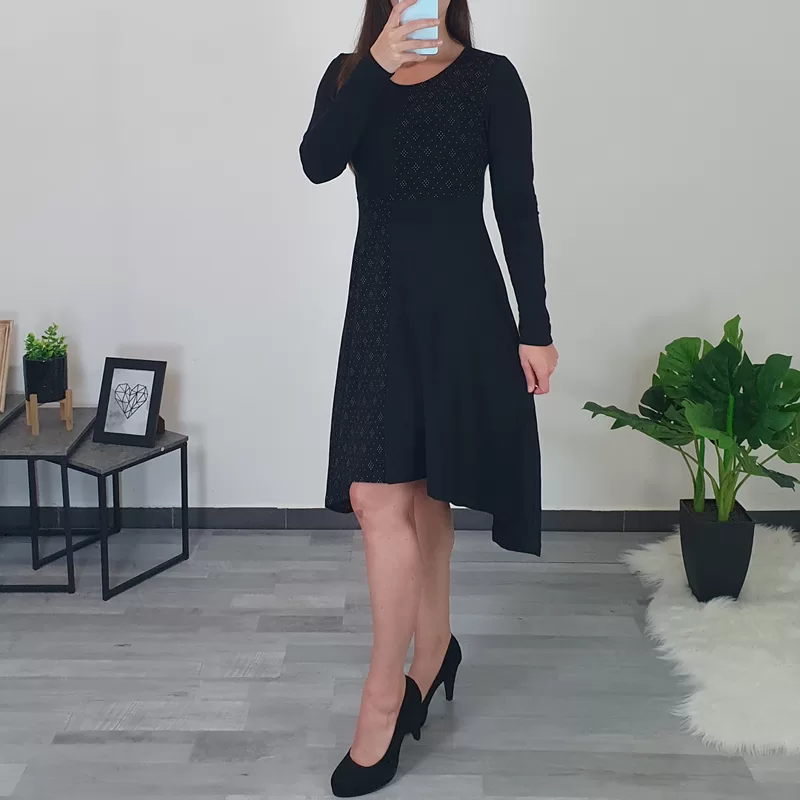 Ženska obleka Emira je v črni barvi, v kombinaciji s srebrnim tiskom. Obleka je asimetrična – spredaj je krajša in zadaj daljša, prav tako je daljša tudi od straneh. Obleka ima dolga rokava, v predelu prsi je oprijeta, spodaj pa je širša. Obleko lahko nosite s svojimi najljubšimi supergami ali s petkami. Na voljo od velikosti 36 do 48.