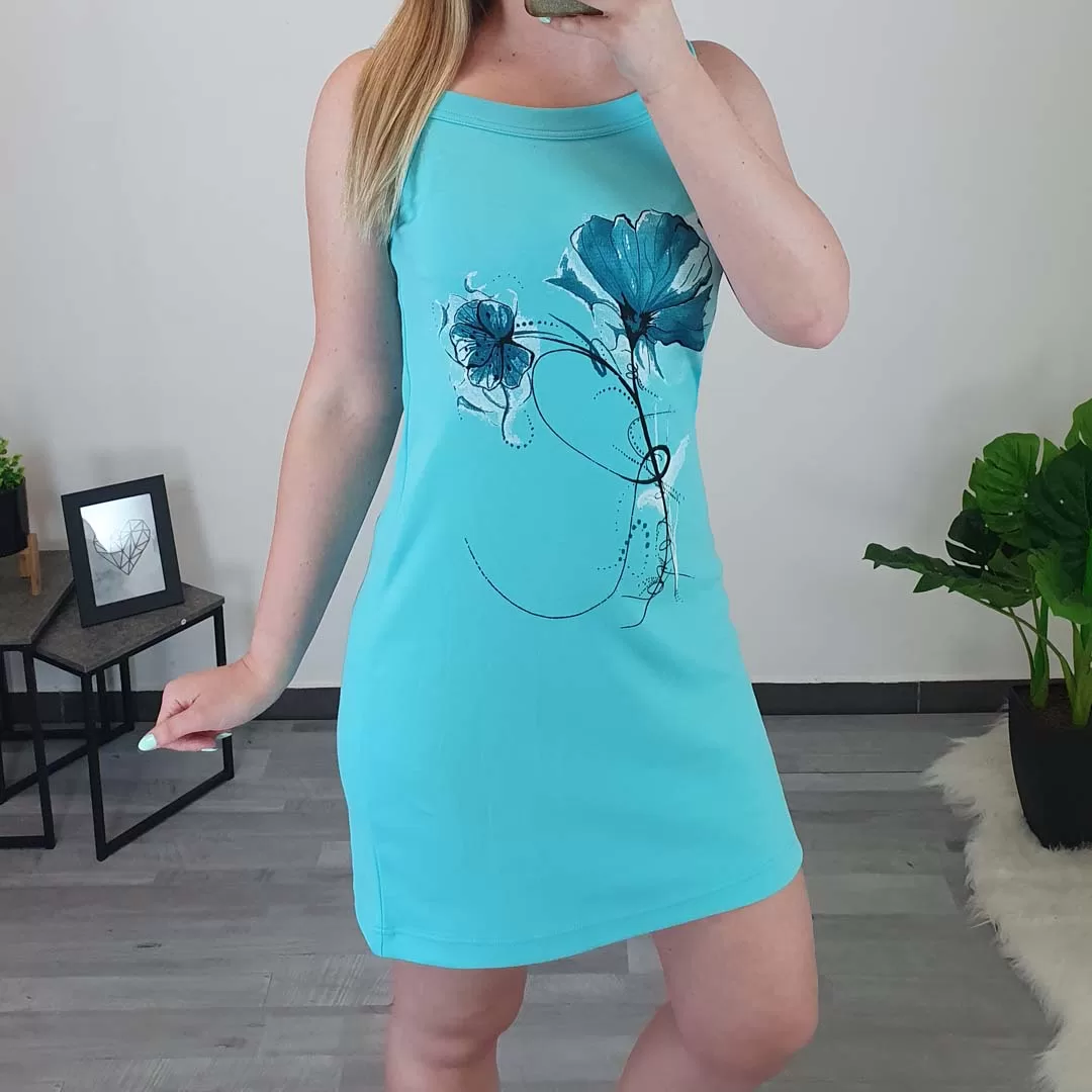Poletna bombažna obleka Katja z ozkimi naramnicami. Obleka je izdelana iz kvalitetnega bombaža in je prijetna za nošenje. Na sprednji strani ima tisk v modri in beli barvi. V obleki se boste počutile sproščeno in je odlična izbira za vroče poletne dni. Na voljo od številke 36 do številke 48.
