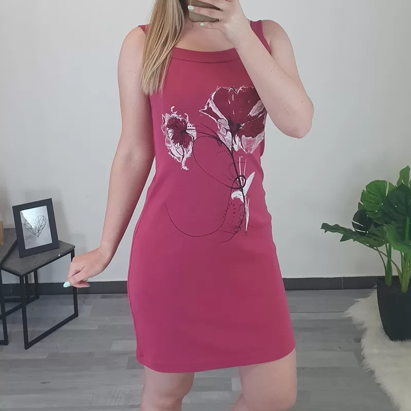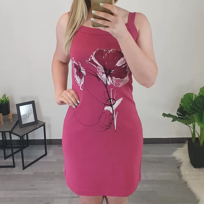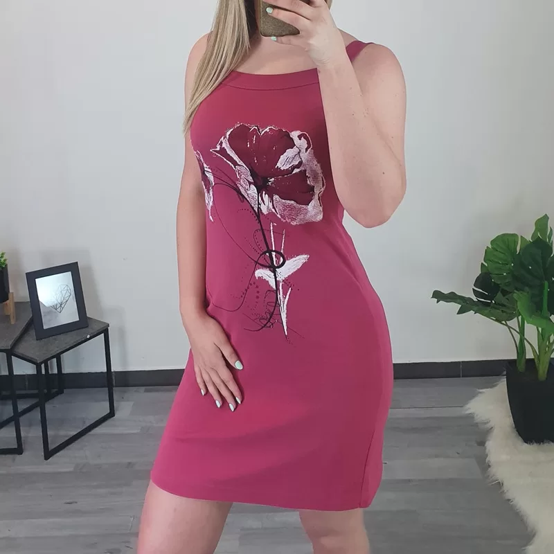 Poletna bombažna obleka Katja z ozkimi naramnicami. Obleka je izdelana iz kvalitetnega bombaža in je prijetna za nošenje. Na sprednji strani ima tisk v črni, bordo in beli barvi. V obleki se boste počutile sproščeno in je odlična izbira za vroče poletne dni. Na voljo od številke 36 do številke 48.