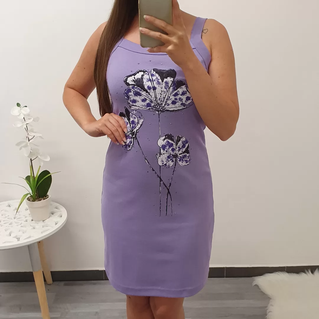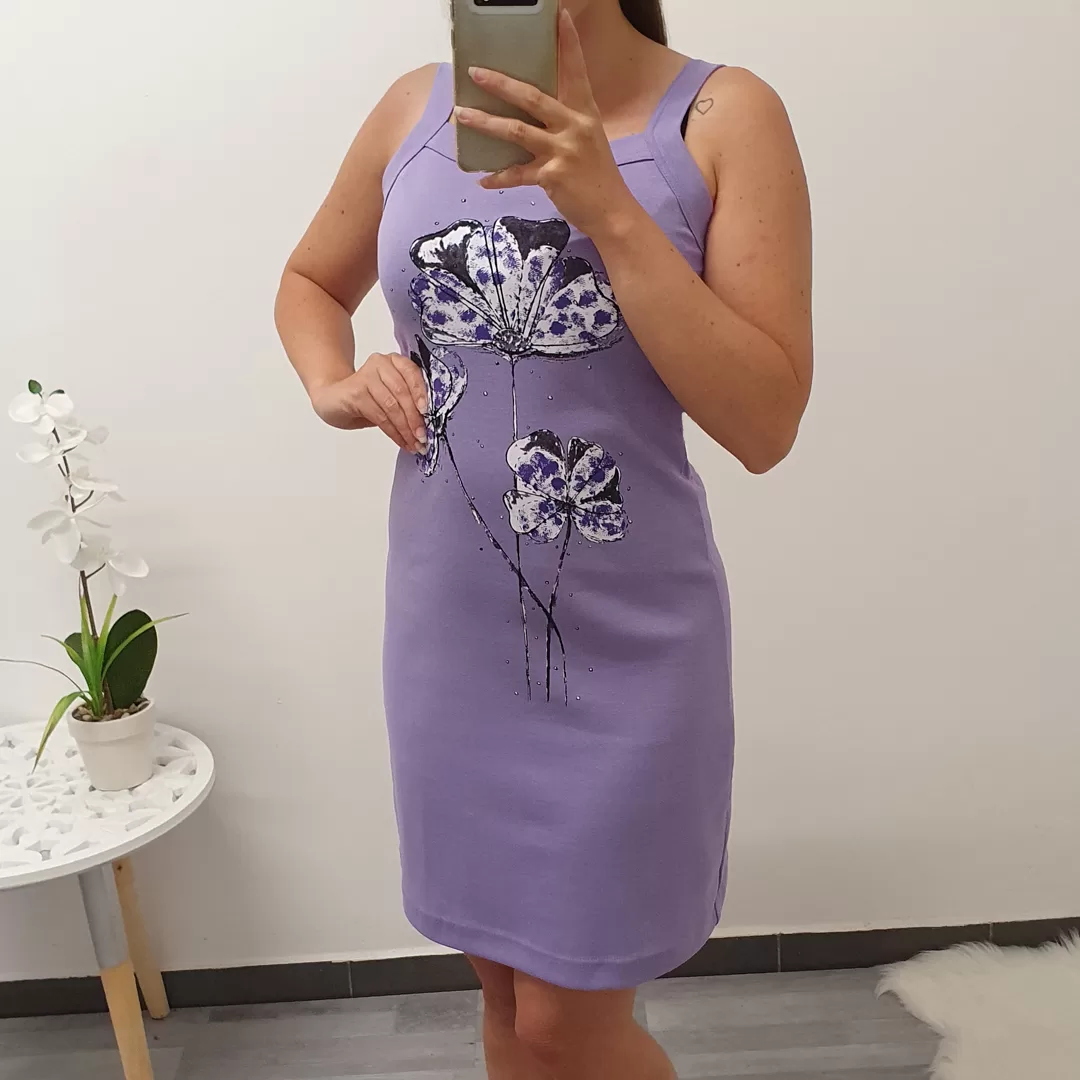 Bombažna obleka Katja z ozkimi naramnicami. Obleka je v vijolični barvi s potiskom.