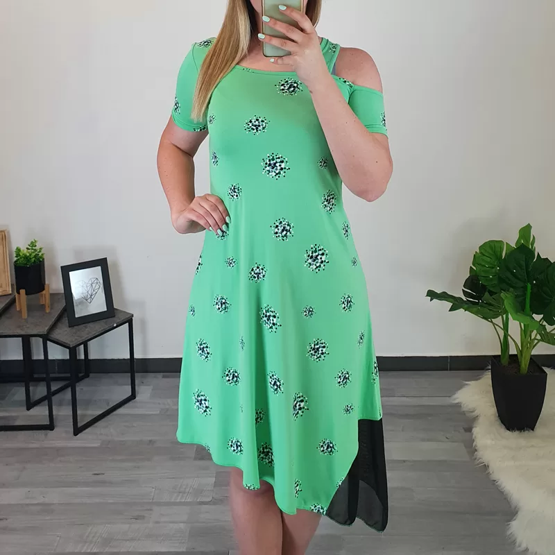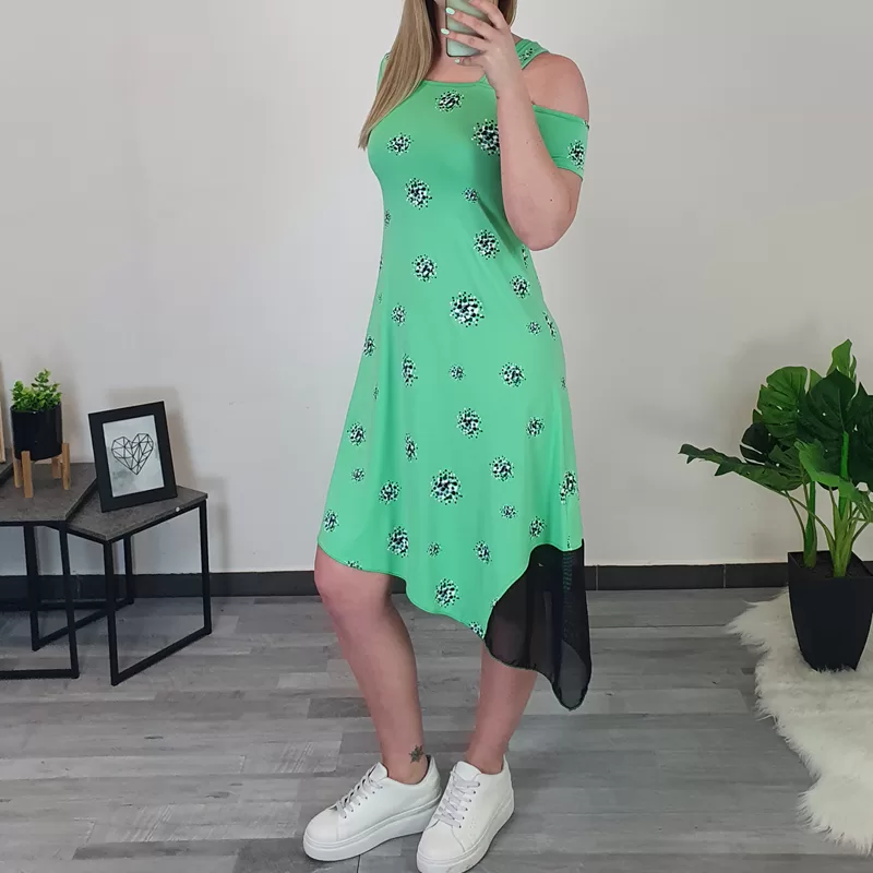 Modna viskozna obleka Klara v zeleni barvi. Po celotni površini je dodan tisk pikic v črni, zeleni in beli barvi. Obleka ima kratka rokava, na desni strani pa odprto ramo. Kroj je asimetričen, na spodnji desni strani je dodan še til, kar obleki daje posebno zanimiv izgled.
