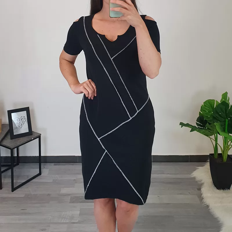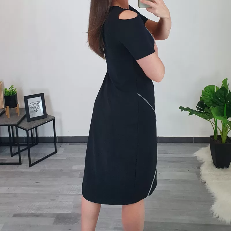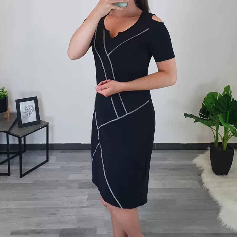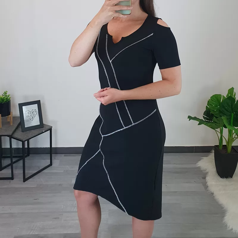 Modna ženska obleka Nika v črni barvi. Obleka ima kratka rokava in odprta ramena. Je rahlo oprijetega modela, na sprednji strani je krajša, na zadnji pa daljša. Poseben izgled ji dajejo zunanji šivi v beli barvi. Na voljo je od številke 36 do 46.