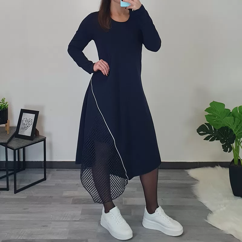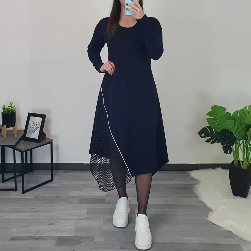 Ženska obleka Reja je narejena in kvalitetnega bombaža, ki ob nošenju ohranja svojo obliko. Obleka ima dolga rokava, krojena je na ‘A’, v prsih je ožja in spodaj širša, primerna za vse postave. Obleka je na sprednji strani kombinirana z mrežico in srebrno dekorativno zadrgo. Obleko lahko nosite tako na športne čevlje, kot tudi na superge.