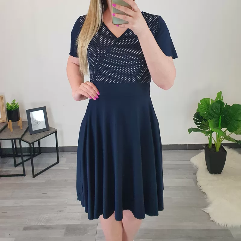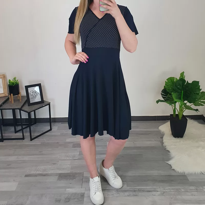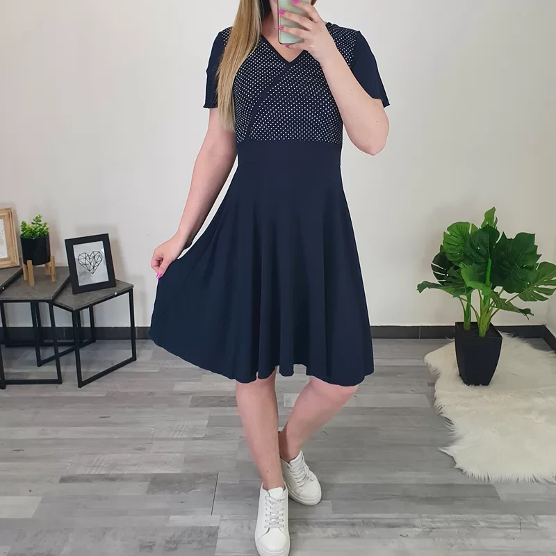 Modna viskozna obleka Ronja v temno modri barvi. Obleka je izdelana iz kvalitetne mešanice viskoze in elastana, ter se lepo prilagaja telesu. Ima kratka valovita prerezana rokava in krilo do kolen. Na sprednjem zgornjem delu jo krasi tisk belih pikic. Krojena je od številke 36 do 44.