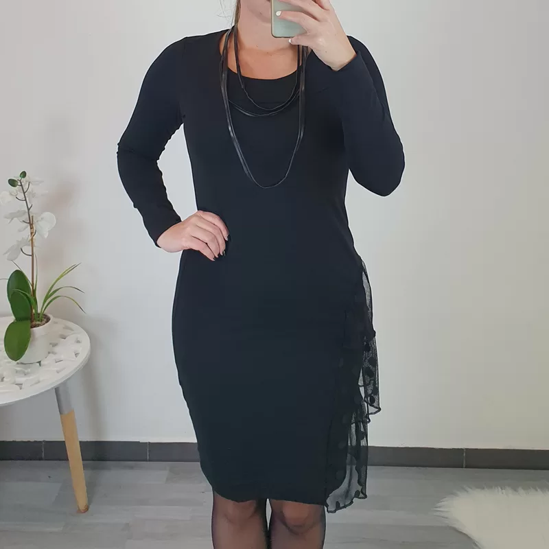 Bombažna ženska obleka Sisi z dolgimi rokavi. Obleka je v črni barvi, na desni strani je dodan til s pikicami, ki obleki da poseben videz. V kompletu z obleko je tudi verižica. Obleka je krojena od velikosti 36 do 46.