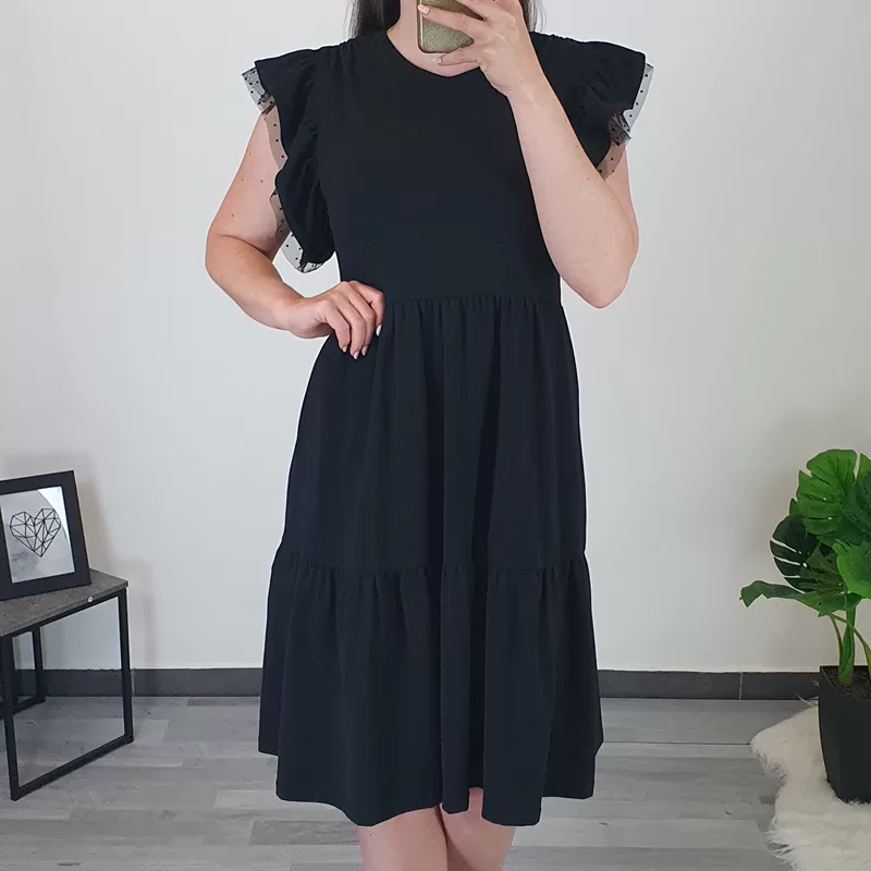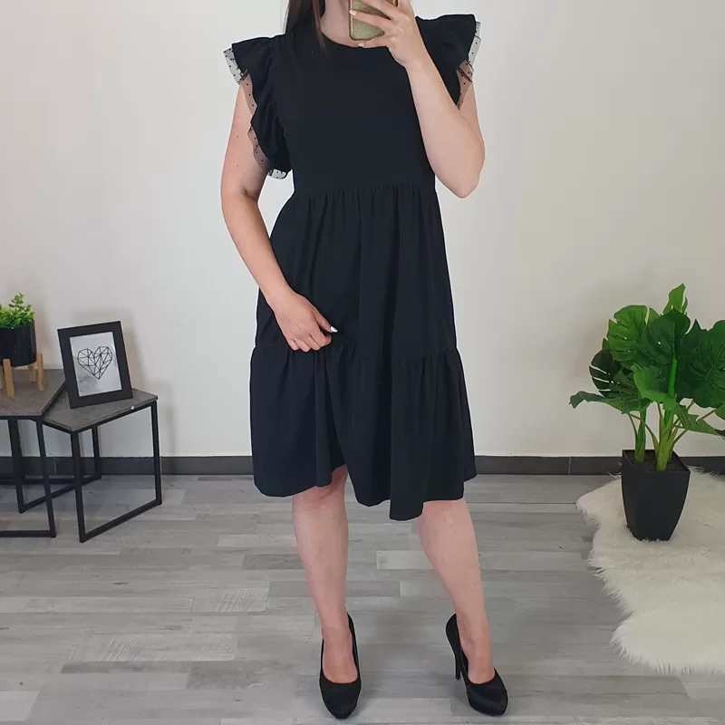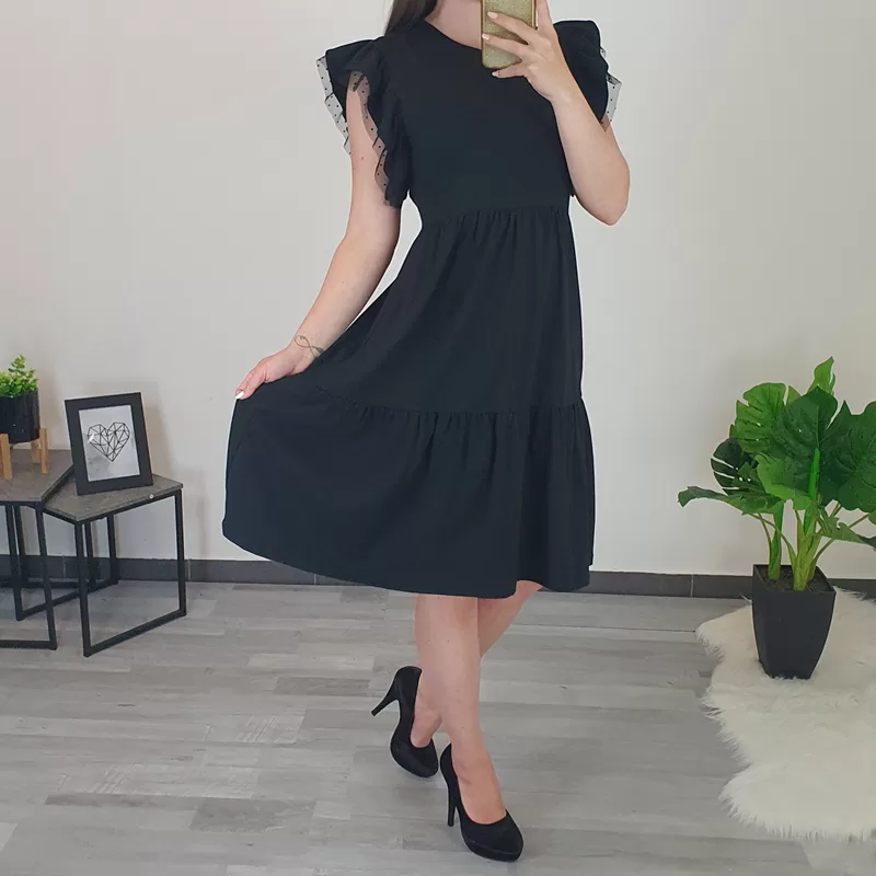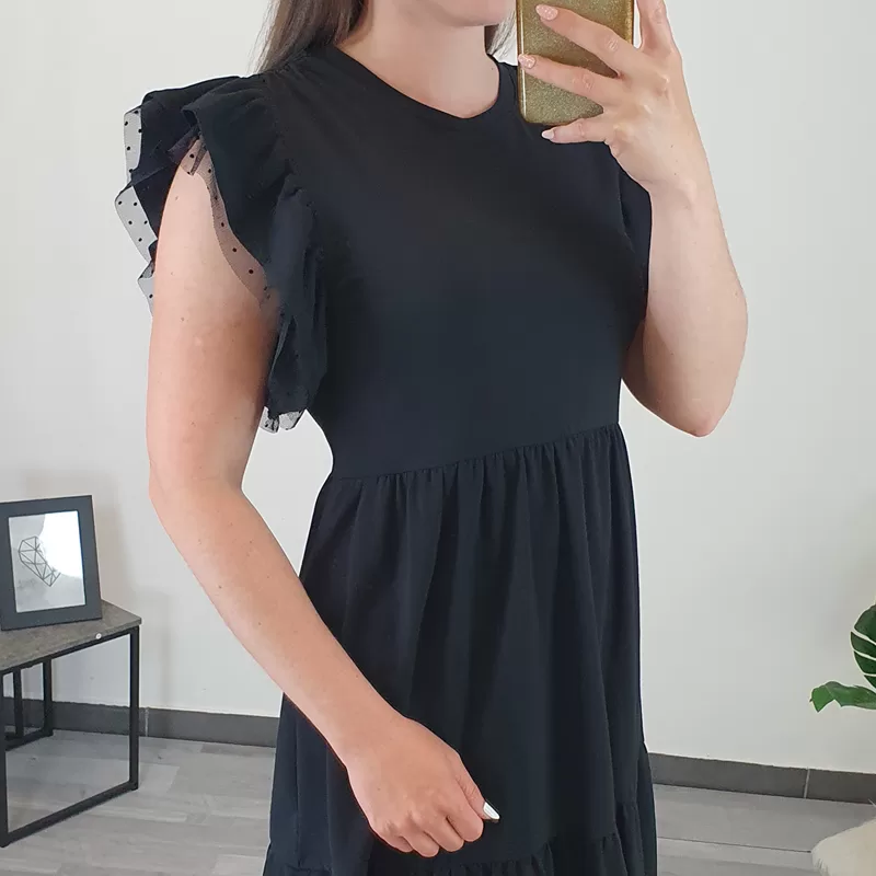 Ženska obleka v črni barvi. Obleka je v prsih oprijeta, spodaj pa je širša. Ob rokavu ima dodan pikasti til. Obleka je prijetna za nošenje, narejena je iz tanjšega bombaža.