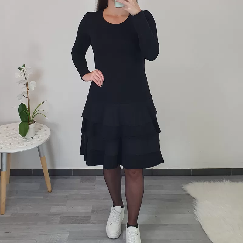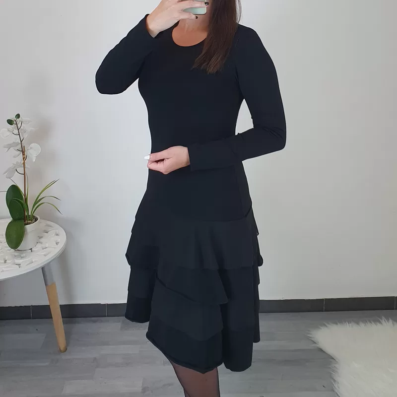 Športno elegantna obleka Suzi z dolgimi rokavi. Obleka je v črni barvi in je kombinirana z volančki in s tilom od pasu navzdol, kar obleki da edinstven videz. Obleko lahko nosite tako na superge, kot tudi na elegantne čevlje.