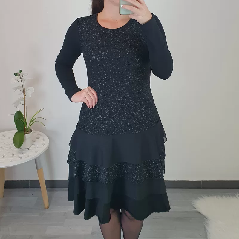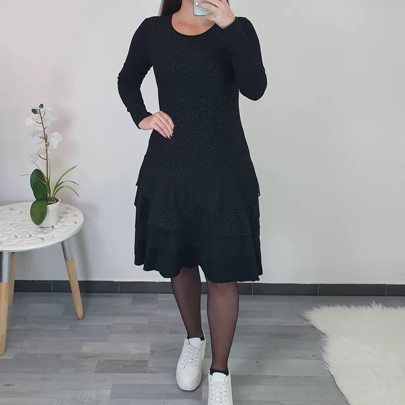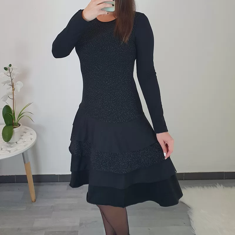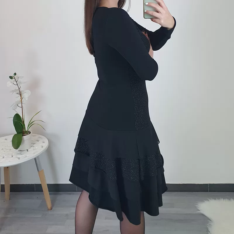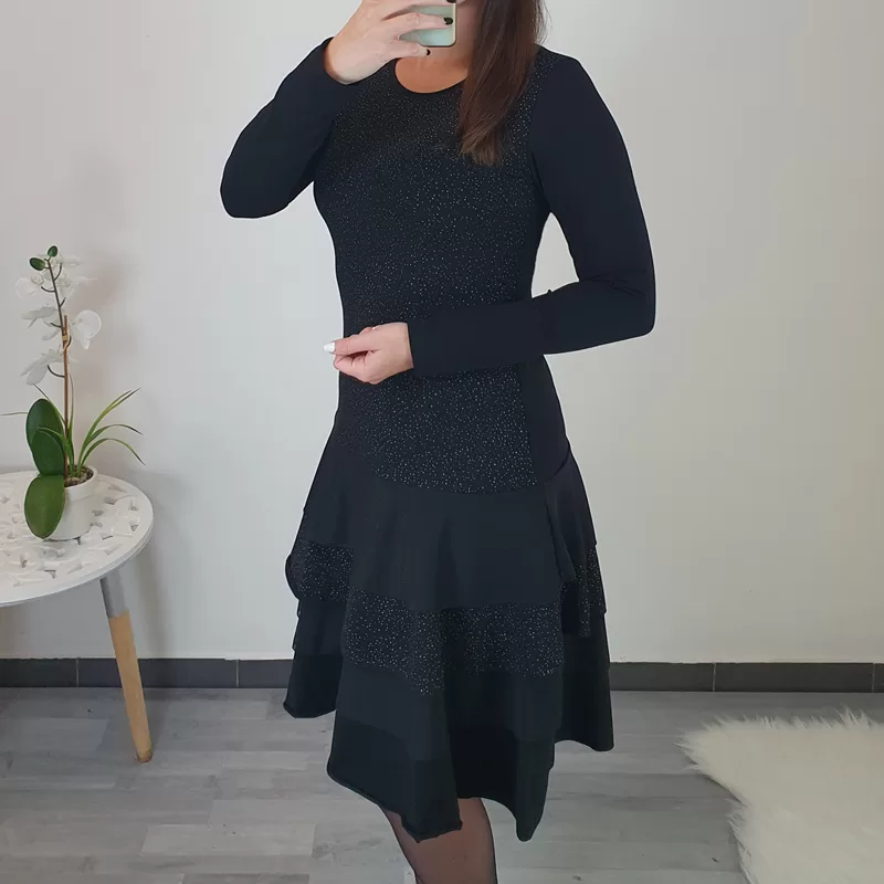 Športno elegantna obleka Suzi v črni barvi s srebrnimi pikicami. Obleka je kombinirana z volančki in s tilom od pasu navzdol, kar obleki da edinstven videz. Na hrbtni strani je v črni barvi in ima dolga rokava. Obleko lahko nosite tako na superge, kot tudi na elegantne čevlje.