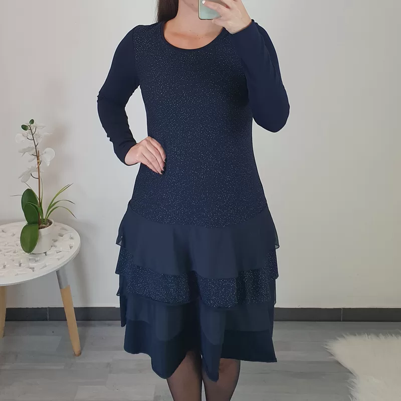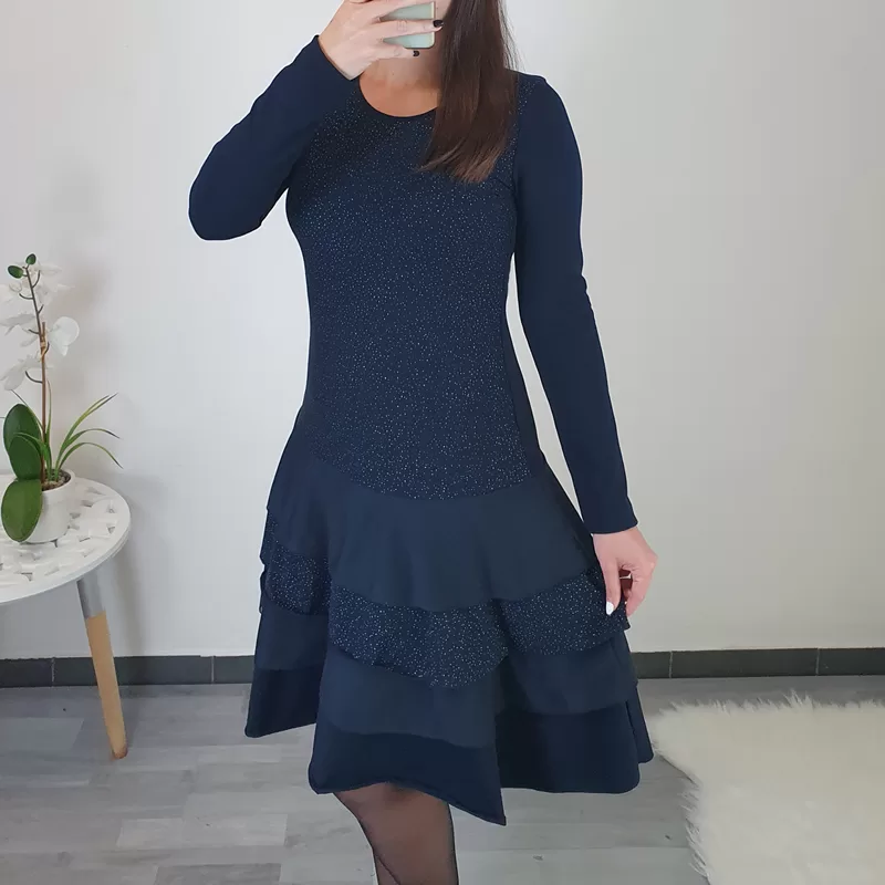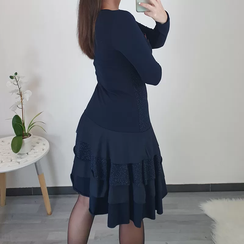 Športno elegantna obleka Suzi v temno modri barvi s srebrnimi pikicami. Obleka je kombinirana z volančki in s tilom od pasu navzdol, kar obleki da edinstven videz. Na hrbtni strani je v črni barvi in ima dolga rokava. Obleko lahko nosite tako na superge, kot tudi na elegantne čevlje.