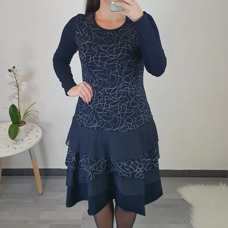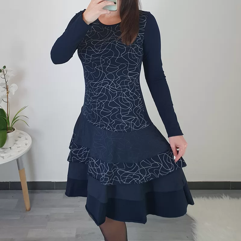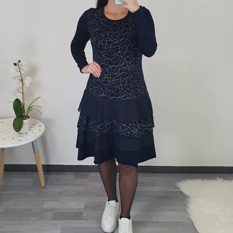 Športno elegantna obleka Suzi v temno modri barvi s srebrnimi vzorcem. Obleka je kombinirana z volančki in s tilom od pasu navzdol, kar obleki da edinstven videz. Na hrbtni strani je v črni barvi in ima dolga rokava. Obleko lahko nosite tako na superge, kot tudi na elegantne čevlje.