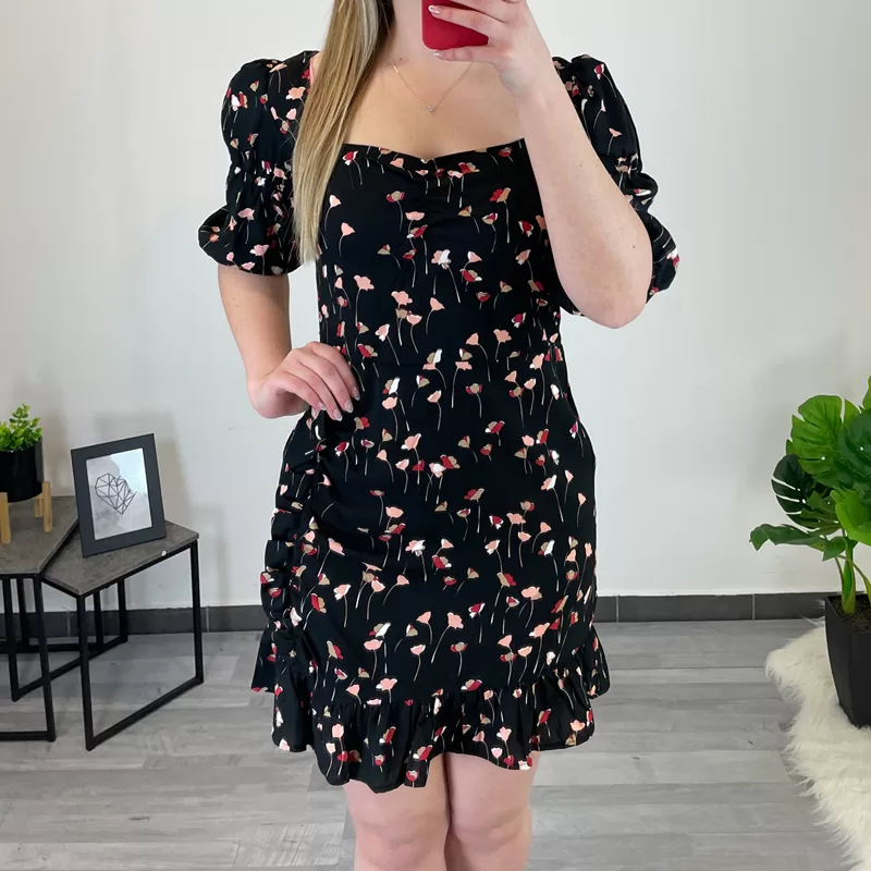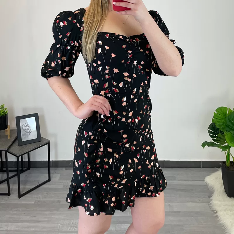 Ženska viskozna obleka v črni barvi. Obleka ima 3/4 rokava, ki se zaključijo z elastiko, kar jim daje ‘balon’ izgled. Na koncu obleke so dodani volančki. Po celi obleki črno blago krasijo cvetice v nežno roza barvi. Izdelana je iz kvalitetne viskoze in je prijetna za nošenje. Na voljo je od številke XS do L.