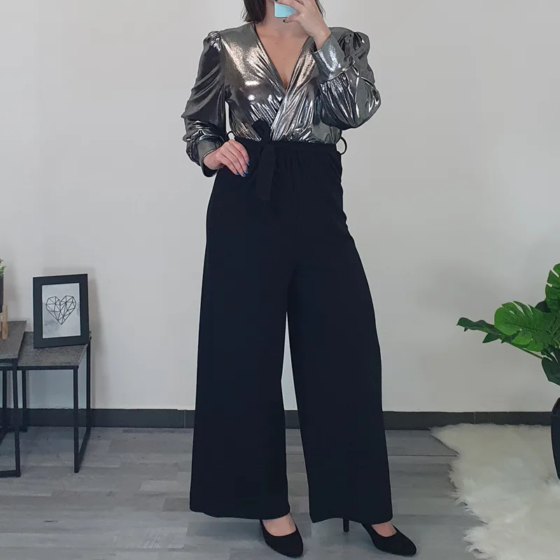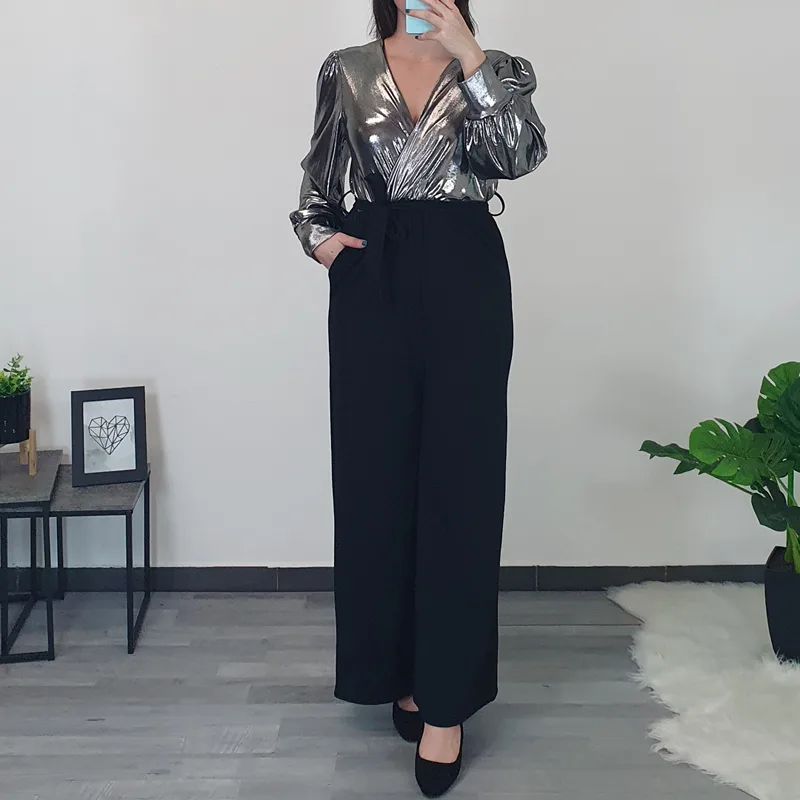Eleganten ženski pajac v črno srebrni barvi. Pajac ima črne hlače s široko hlačnico in srebrn zgornji del. Velikost je univerzalna, primerna za S-L.