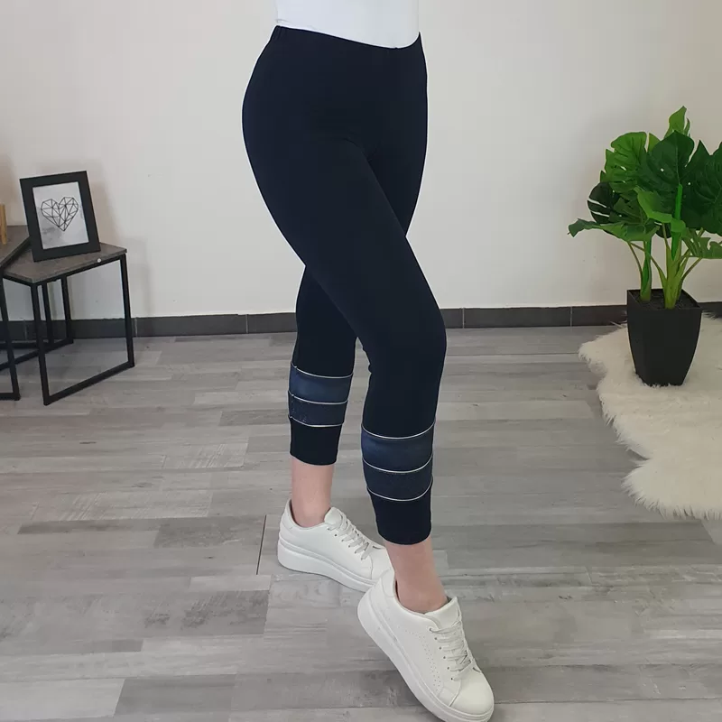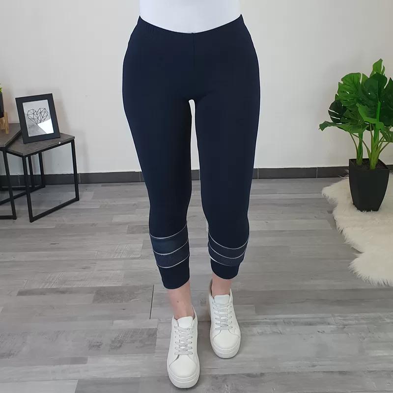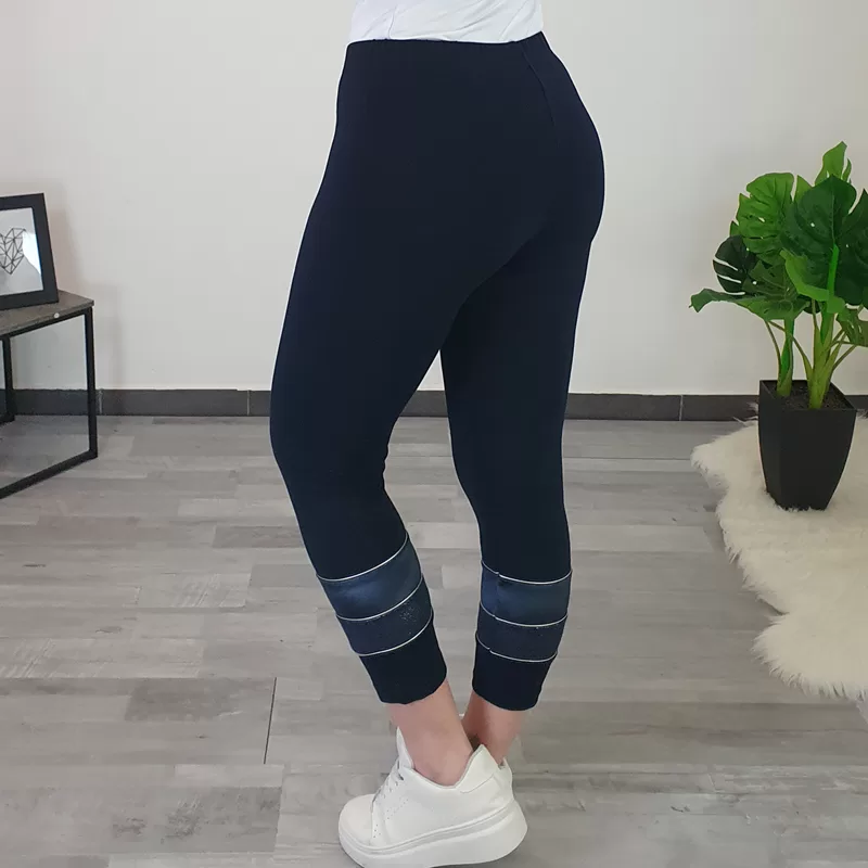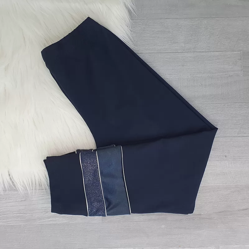 Modne bombažne pajkice Izabela v temno modri barvi. Pajkice imajo višji pas, hlačnice so ozke in dolžine 7/8. Na obeh hlačnicah je dodano bleščeče blago in srebrn trak. Izdelane so iz kvalitetne mešanice bombaža in elastana, pri nošenju ohranjajo svojo obliko. Na voljo so od številke 38 do 50.