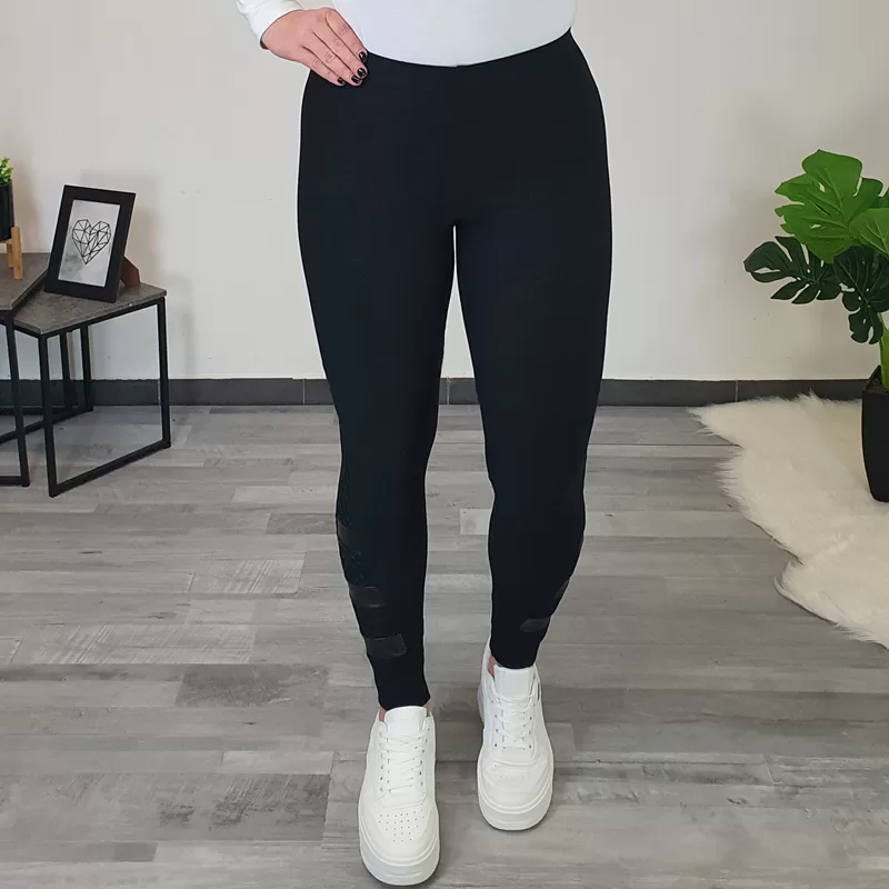 Modne pajkice Lea v črni barvi. Pajkice imajo malenkost višji pas, hlačnice so dolge in oprijete. Na koncu hlačnic pajkice krasi blago imitacije usnja in mrežice. Zaradi teh detajlov, pajkice pašejo na različne stile obutev. Izdelane so iz kvalitetnega bombaža, ki ob nošenju ohranja svojo obliko.