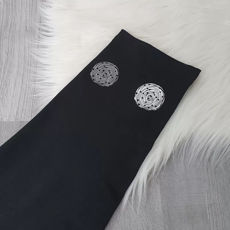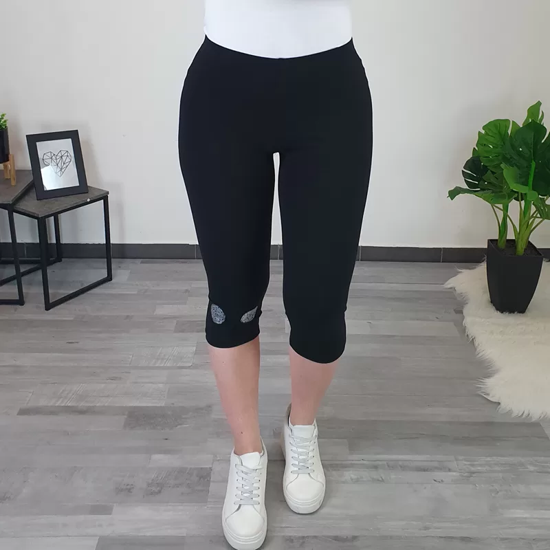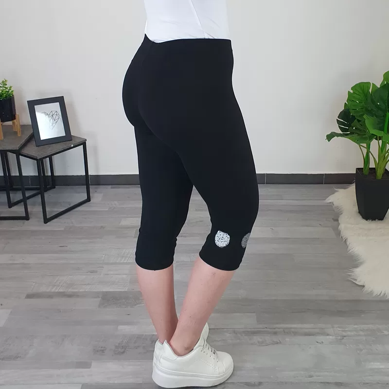 Ženske pajkice Minka v črni barvi. Pajkice imajo višji pas, hlačnice so ozke in v dolžini 3/4. Na levi hlačnici imajo dodane štiri kroge. Pajkice lahko kombinirate tako s športnimi, kot tudi s poletnimi čevlji.