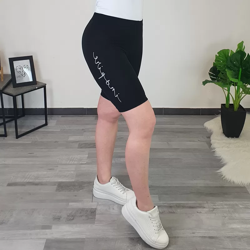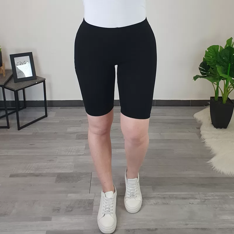 Modne bombažne pajkice Nena v črni barvi. Hlače imajo višji pas, hlačnice pa so kratke in ozke. Na levi hlačnici jih krasi srebrn napis INSPIRE. Na voljo so od številke 36 do 46.
