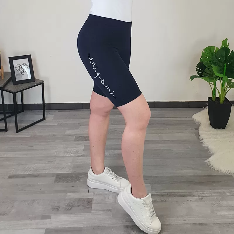 Modne bombažne pajkice Nena v temno modri barvi. Hlače imajo višji pas, hlačnice pa so kratke in ozke. Na levi hlačnici jih krasi srebrn napis INSPIRE. Na voljo so od številke 36 do 46.