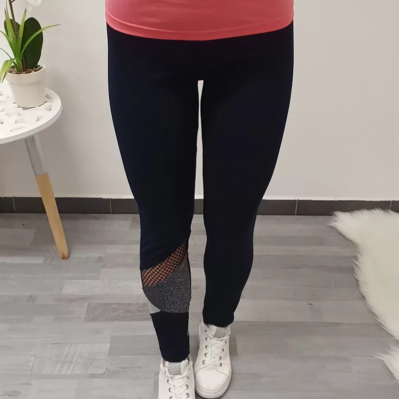 Pajkice Živa v temno modri barvi. Pajkice imajo na levi hlačnici dodano mrežo, sivo in svetleče blago.