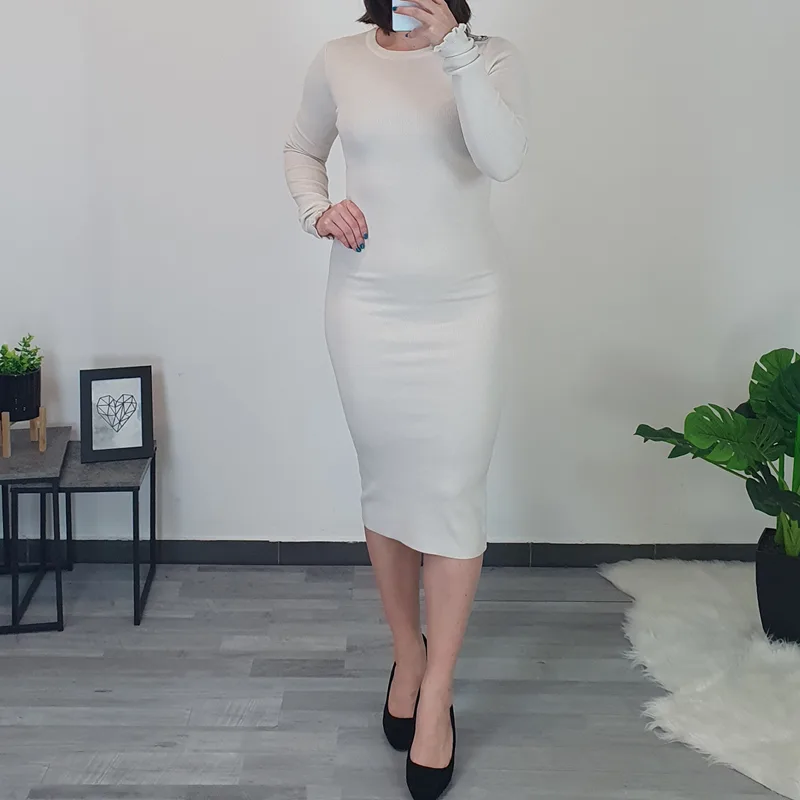 Pletena ženska obleka v bež barvi.