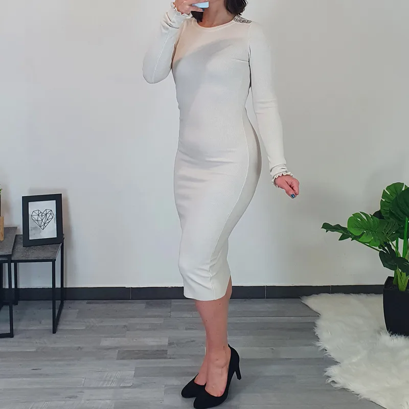 Pletena ženska obleka v bež barvi. Kroj obleke je oprijet in sega čez kolena. Na ramenih ima dodane svetleče kamenčke. Obleka je na voljo v velikosti S/M in M/L.