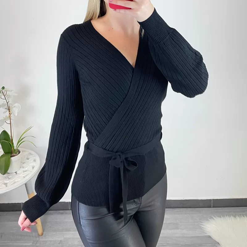 Ženska pletena majica v črni barvi. Majica ima širok rokav, na koncu rokava je dodan patent. Majica ima ovratnik na preklop, ki se konča s širšim patentom. Dodan je tudi trak, ki se zaveže okoli pasu, kar da majici eleganten izgled. Material je mehak in elastičen.