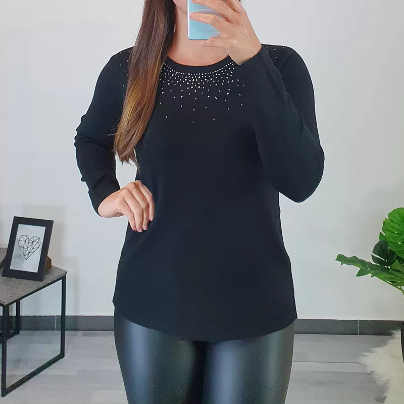 Ženski pleten pulover v črni barvi. Pulover ima dolga rokava, ob vratu ga krasijo srebrni kamenčki. Pulover je narejen iz mešanice viskoze in modala, je elastičen, na otip zelo mehak in prijeten za nošenje.