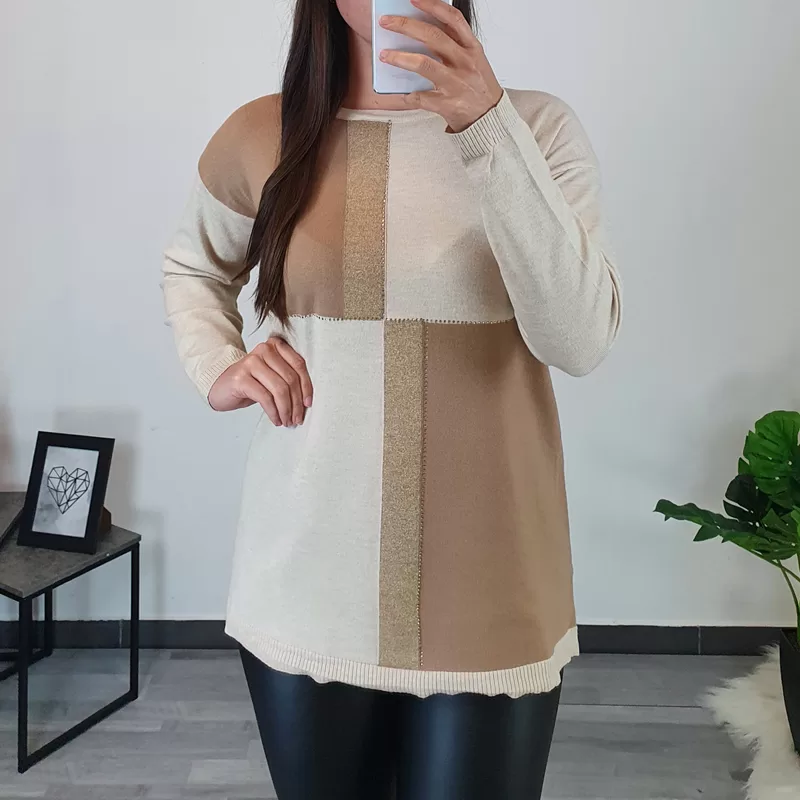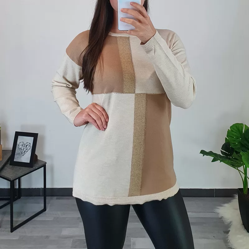 Ženski pleten pulover z dolgimi rokavi. Pulover je v bež barvi, na sprednji strani je kombiniran še z rjavo in zlato, dodane ima tudi zlate kamenčke. Pulover je odličnega kroja, ni teliran in je primeren za vse postave. Narejen je iz mešanice viskoze in modala, je elastičen in mehak, zelo prijeten za nošenje.