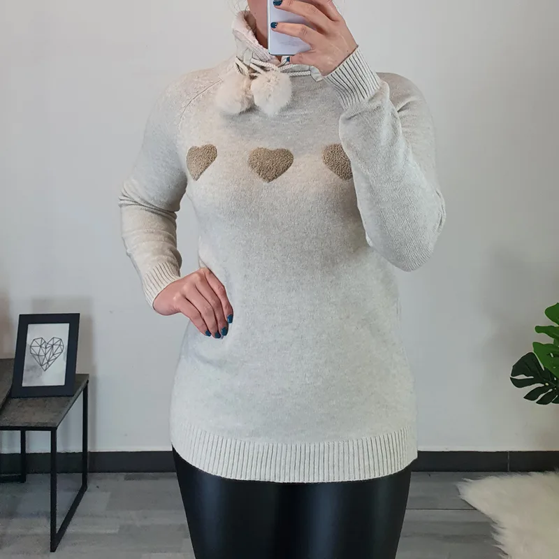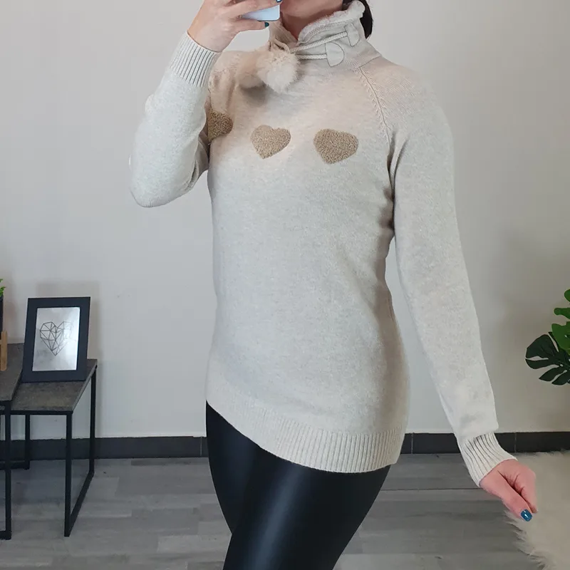 Ženska pletenina v bež barvi. Ima dolga rokava in visok kosmaten ovratnik. Na sprednji strani jo krasijo trije srčki. Pletenino lahko nosite samostojno ali kot puloverček.