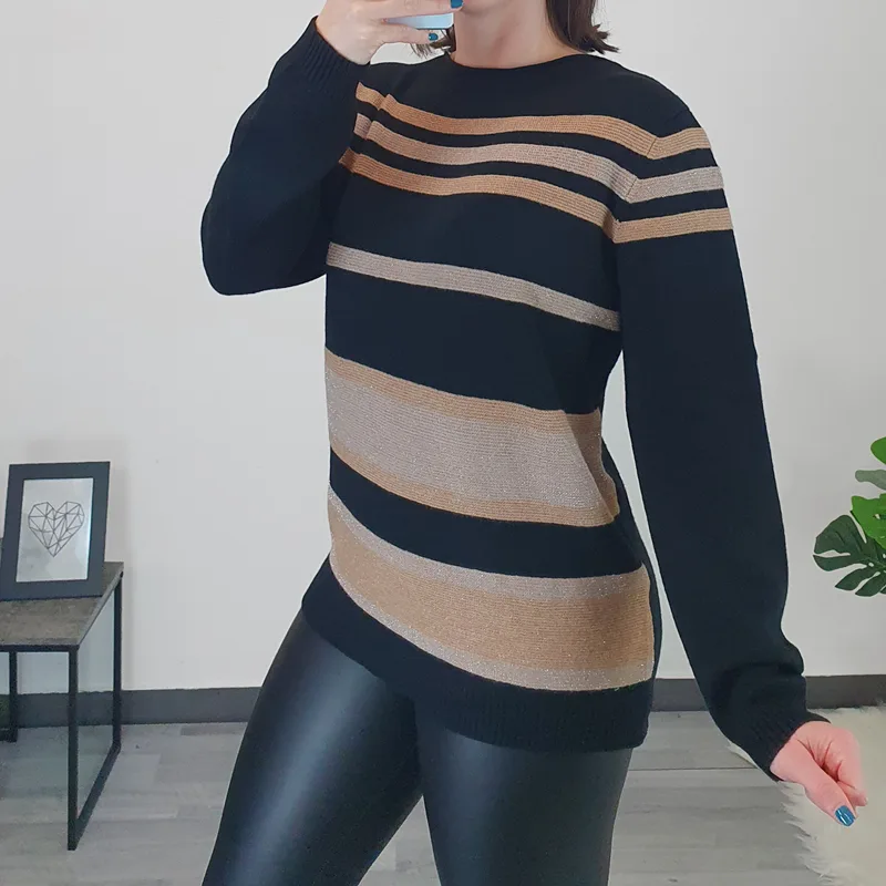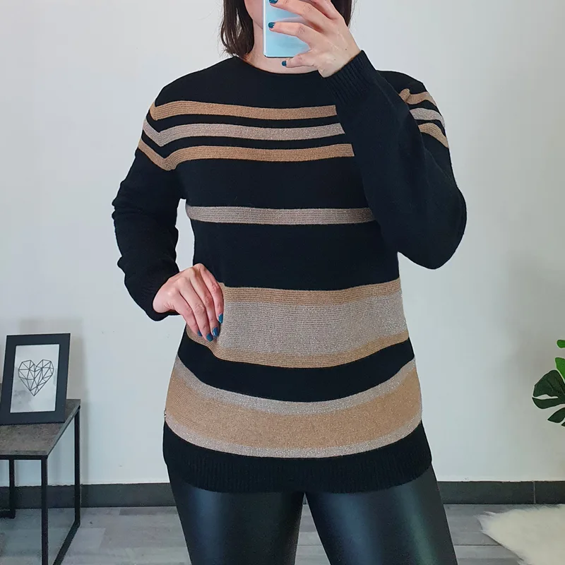 Ženska črtasta pletenina v kombinaciji črne in bež. Pletenino lahko nosite samostojno ali kot puloverček.