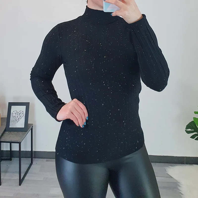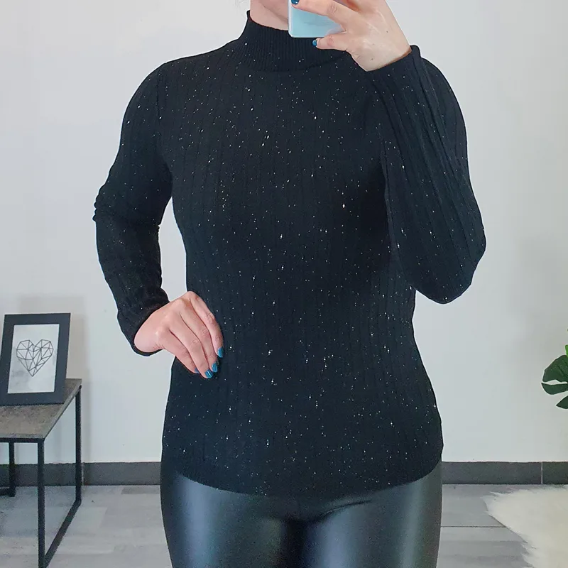 Ženska pletenina v črni barvi. Ima dolga rokava in polpuli ovratnik. Dodane so bleščice kar ji daje poseben izgled.
