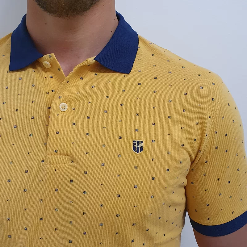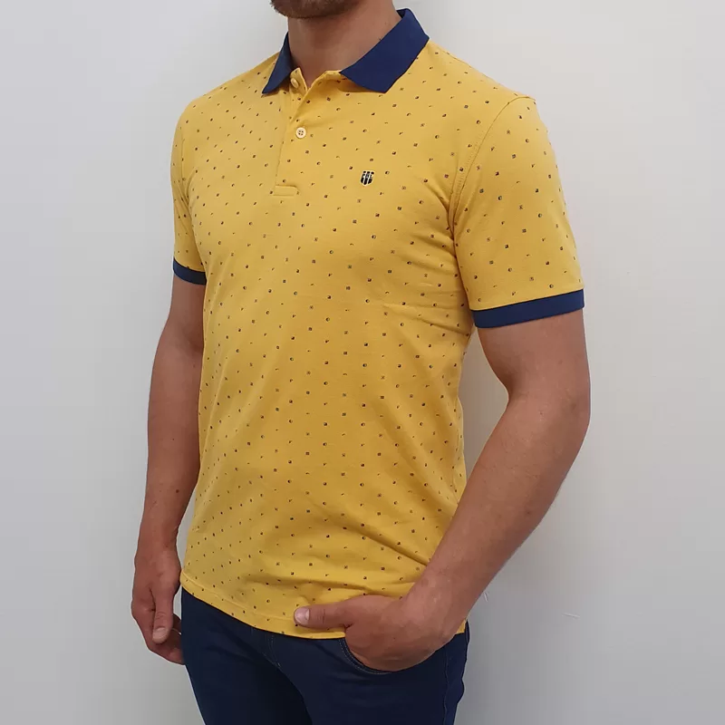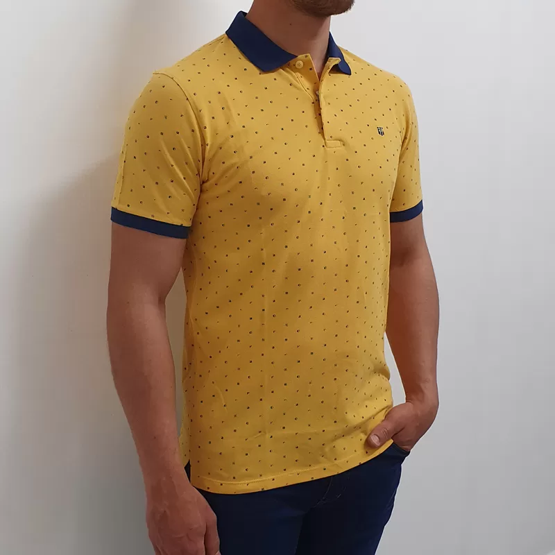 Moška polo majica s kratkimi rokavi. Majica je v rumeni barvi, v kombinaciji s temno modro.