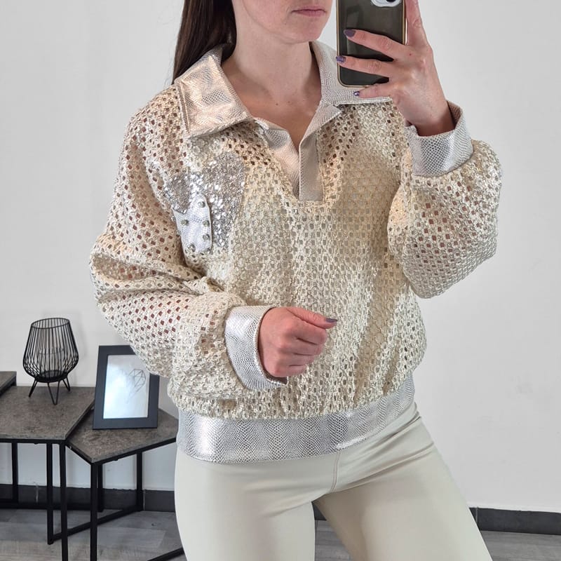 Modni ženski pulover iz serije Bella v zlato-bež kombinaciji. Pulover je izdelan iz mešanice bombaža in viskoze in ima po celotni površini luknjice. Na rokavu in na koncu je zaključen z patentom. Ovratnik je na “V”. Velikost je univerzalna in je primerena za številke od številke S do 2XL.