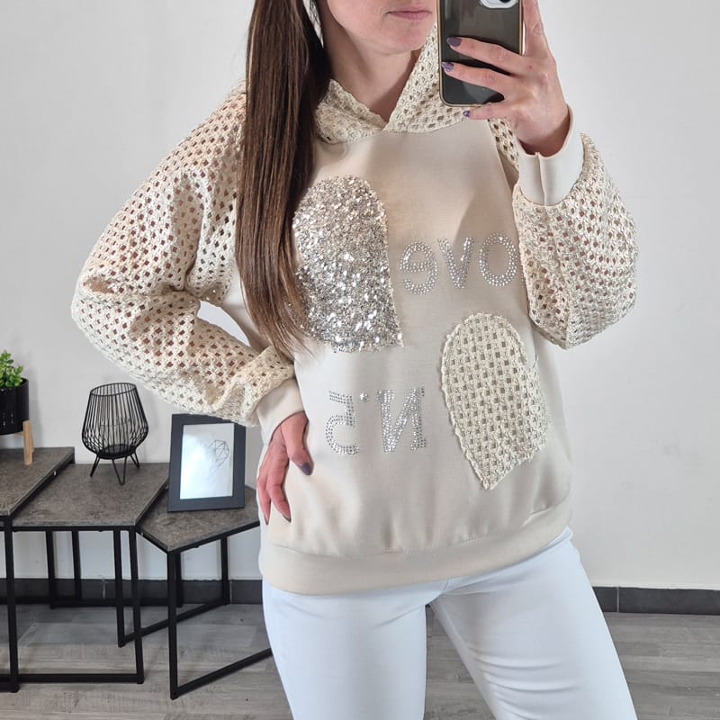 Modni ženski pulover iz serije Bella v zlato-bež kombinaciji. Pulover je izdelana iz mešanice bombaža in najlona. Pulover ima kapuco, na sredini prišit motiv srca. Rokava pa so izdelana iz nepodloženega blaga z luknjicami, na koncu je dodan patent. Velikost je univerzalna in je primerna za številke od številke S do L.