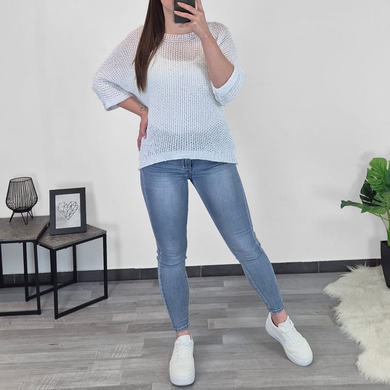 Tanka ženska pletenina v beli barvi. Pulover je krojen na metuljčka in ima 3/4 rokava. Velikost je univerzalna, primerna za velikosti od S do XXL.