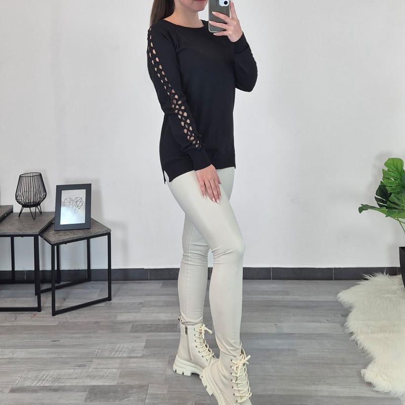 Ženska pletenina iz viskoze v črni barvi. Od ovratnika do patenta na rokavu poteka luknjičasti vzorec v obliki kite. Kita se nekoliko posveti. Pletenino lahko nosite samostojno ali kot puloverček. Je univerzalne velikosti in pokriva številke od M do XL.