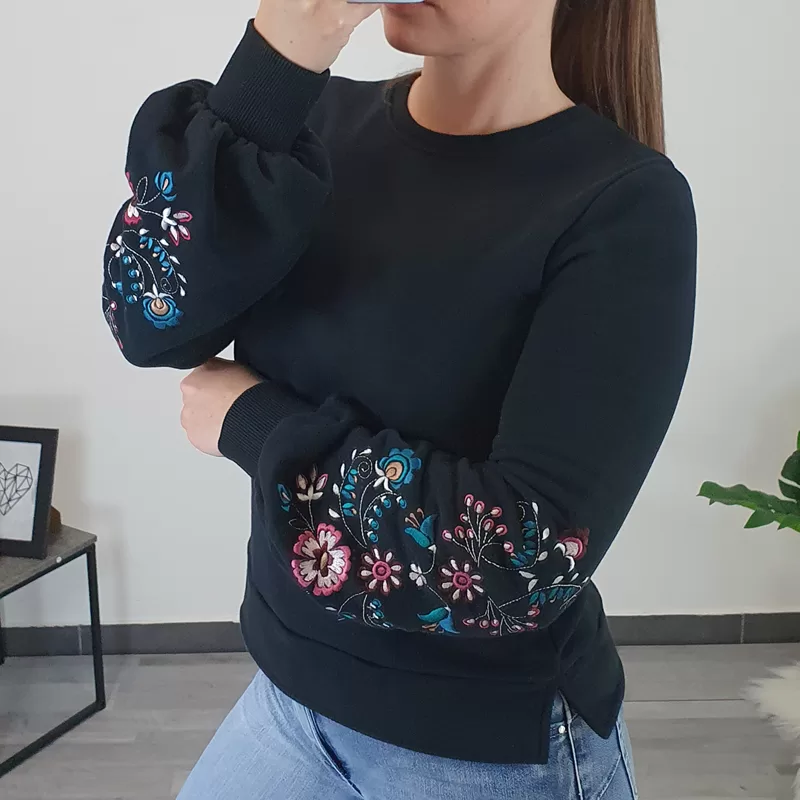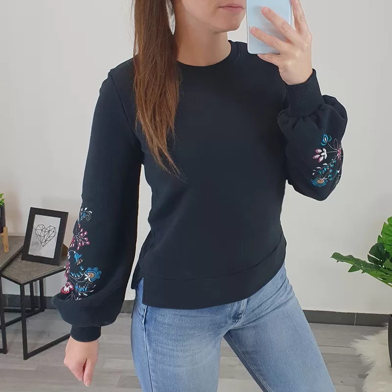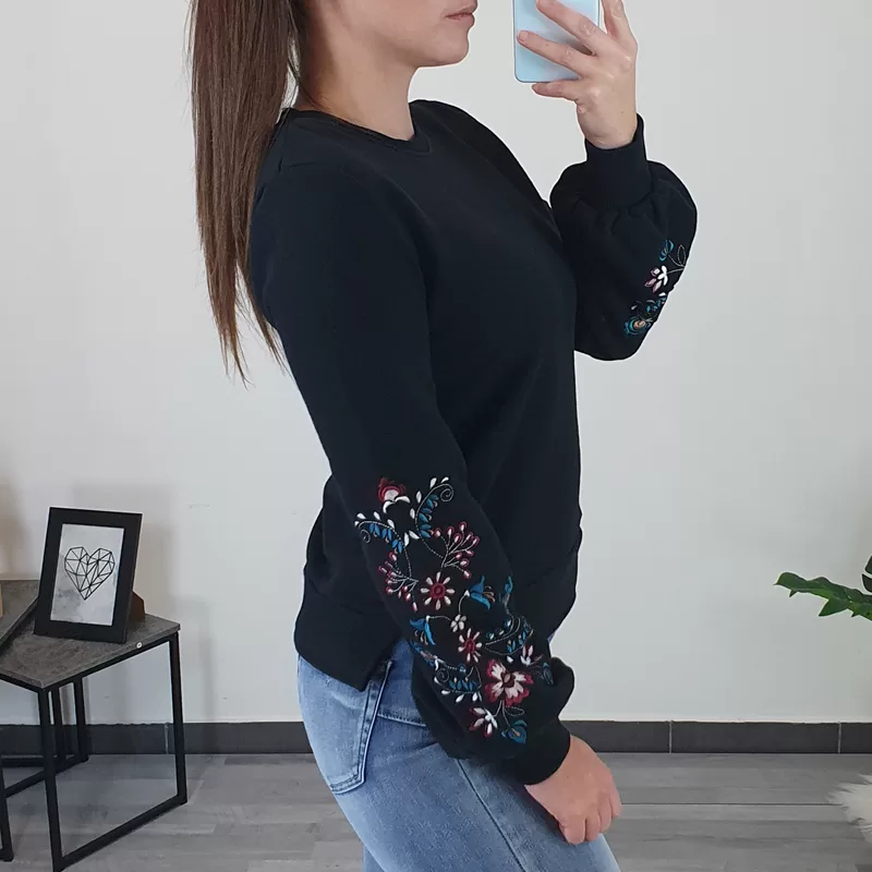 Moden ženski pulover v črni barvi. Pulover je brez kapuce, ima dolga rokava ki se zaključujejo s rebrastim patentom. Enako blago je dodano tudi ob ovratniku. Na rokavih je dodano pisano vezenje s cvetličnim motivom. Na voljo je od številke XS do XL.