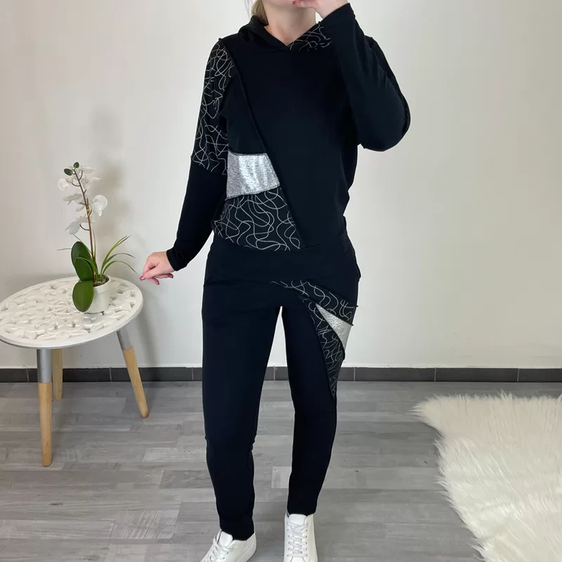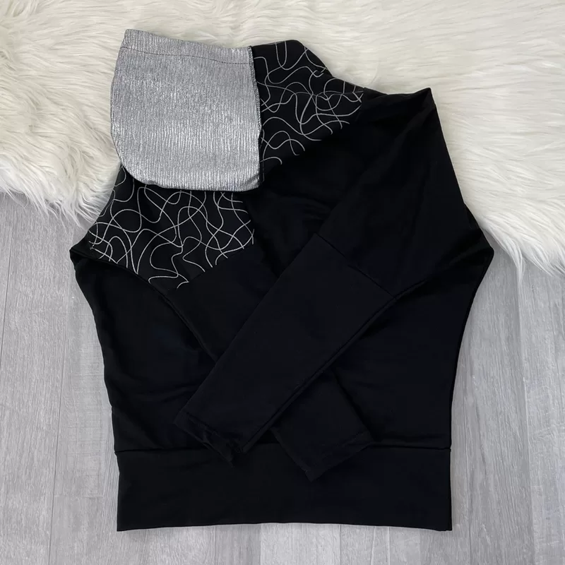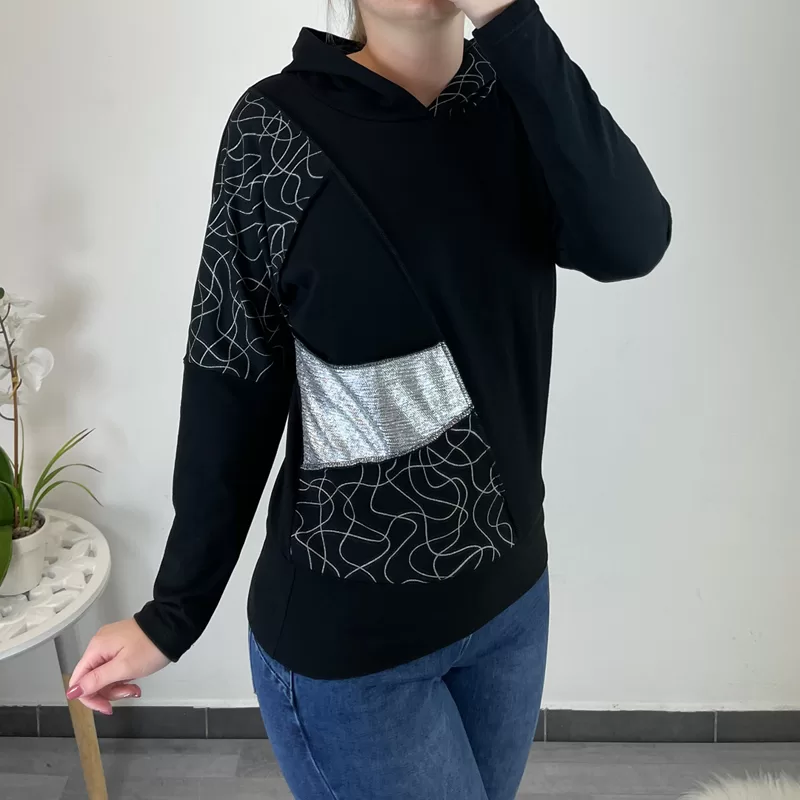 Moden športen pulover Sabrina v črni barvi. Jopa ima kapuco v kombinaciji s srebrno, prav tako je s srebrnim blagom in srebrnimi črtami kombinirana leva stran. Pulover je krojen na ‘metuljčka’ oz nima ramen. Na spodnjem delu je dodan patent.
