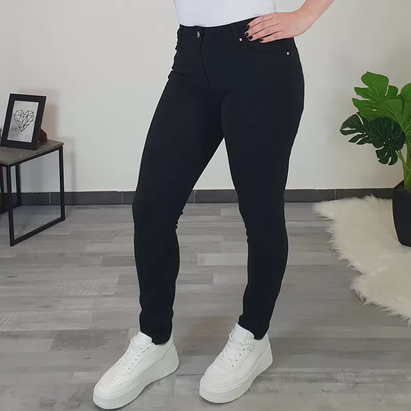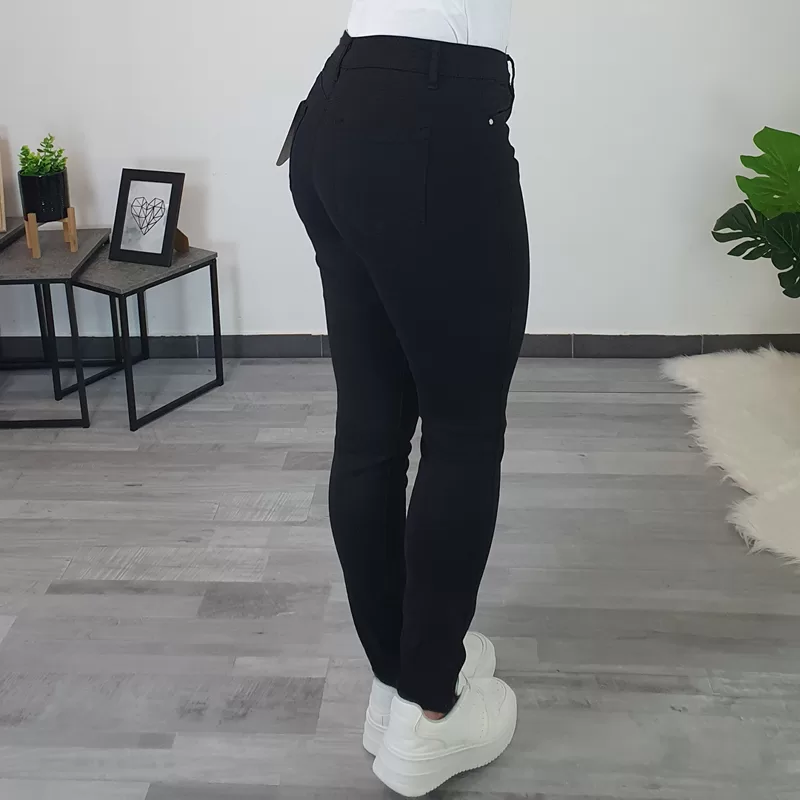 Ženske push up hlače v črni barvi. Hlače so izredno udobne, narejene so iz zelo elastičnega in mehkega materiala. Hlačnice so ozke, pas je višji, na zadnjici in ob straneh imajo dodane žepe. Zadnji del hlač je oblikovan tako, da lepo poudari vašo postavo.