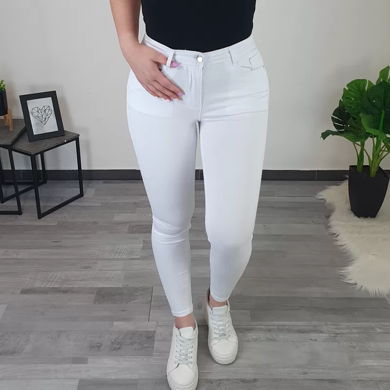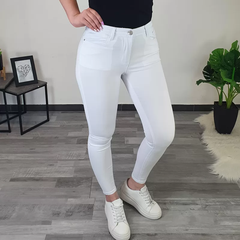 Ženske push up hlače v beli barvi. Hlače so izredno udobne, narejene so iz zelo elastičnega in mehkega materiala. Hlačnice so ozke, pas je višji, na zadnjici in ob straneh imajo dodane žepe. Zadnji del hlač je oblikovan tako, da lepo poudari vašo postavo.