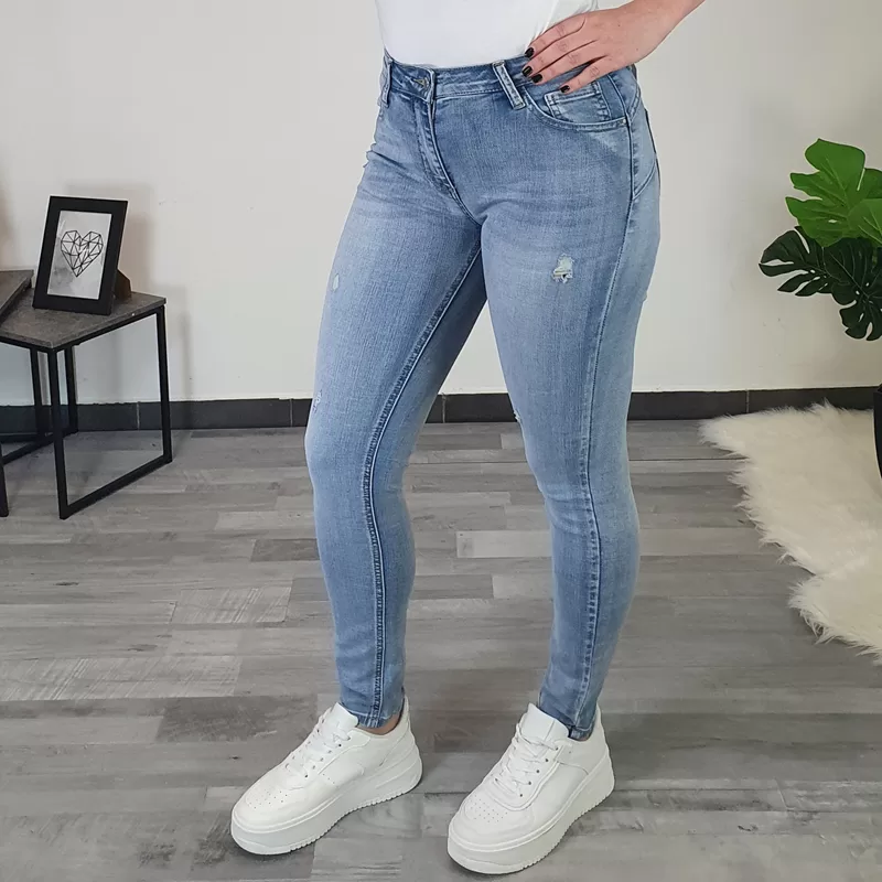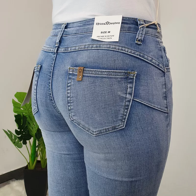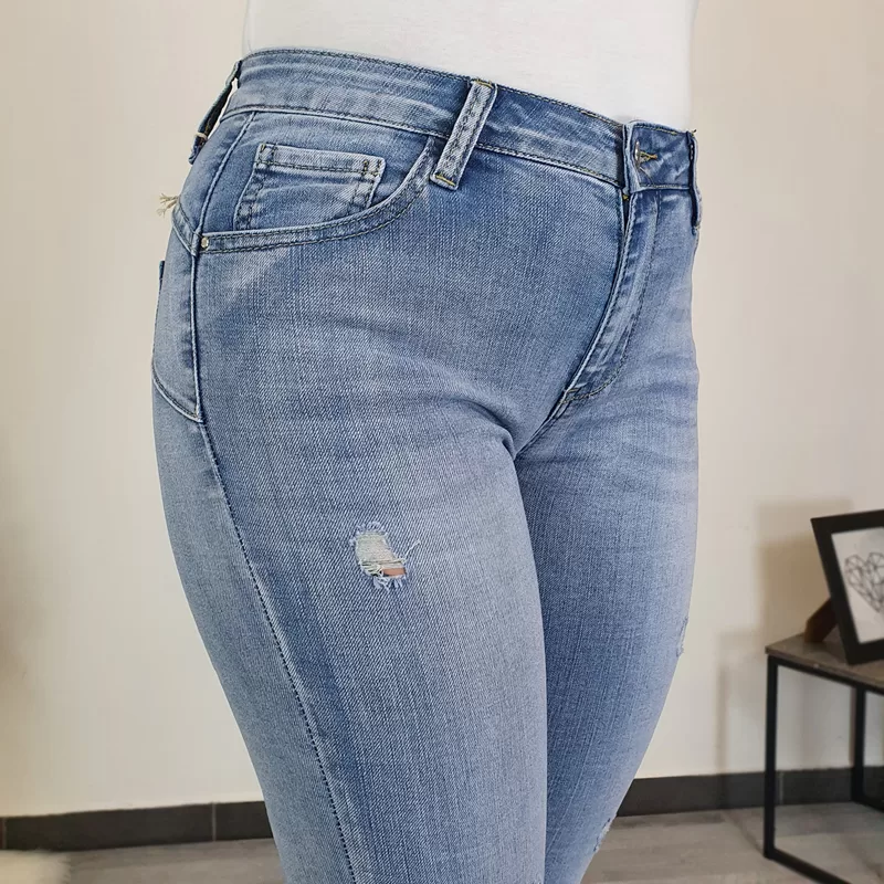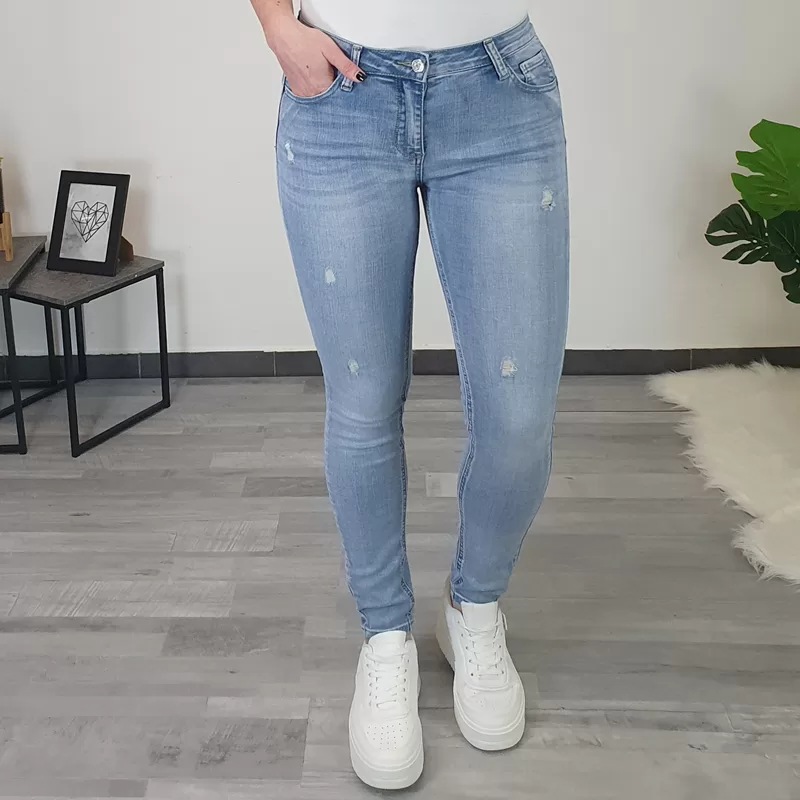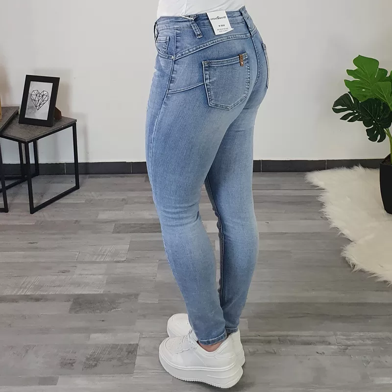 Ženske push up jeans hlače v svetlejši barvi. Kavbojke so zelo elastične ter udobne za nošenje. Hlače imajo videz spranega jeansa z manjšimi razporki na hlačnicah, zadnji del hlač pa je oblikovan tako, da lepo poudari vašo postavo. Hlače se zapenjajo z zadrgo in imajo dva žepa na sprednji strani in dva žepa na zadnji strani. Hlače boste odlično kombinirale s svojimi najljubšimi oblačili.