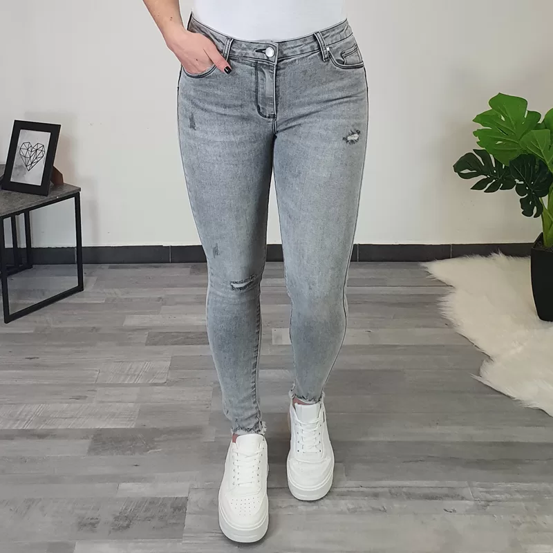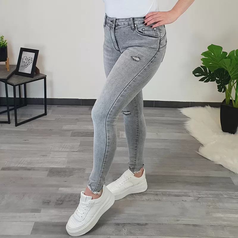 Ženske push up kavbojke v svetlo sivi barvi. Hlače so izdelane iz bombaža in so elastične ter udobne za nošenje, zadnji del hlač pa je oblikovan tako, da lepo poudari vašo postavo. Kavbojke imajo manjše razporke na hlačnicah, hlačnice so ožje, primerne za drobne postave, v spodnjem delu so natrgane. Hlače se zapenjajo z zadrgo in imajo dva žepa na sprednji strani in dva žepa na zadnji strani. Hlače boste odlično kombinirale s svojimi najljubšimi oblačili.