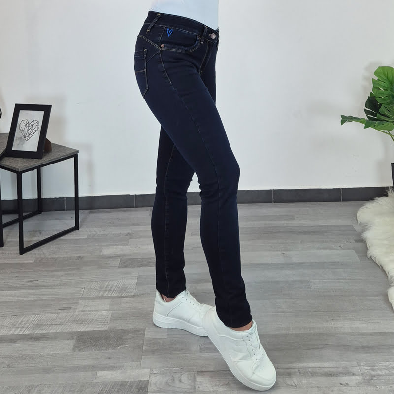 Ženske Scoch kavbojke v temni jeans barvi z nizkim pasom. Zadnji del hlač je oblikovan tako, da lepo poudari vašo postavo. Hlače imajo žepe spredaj in zadaj, zapenjajo se z zadrgo. Ob levem žepu je dodano vezeno modro srce. Hlače so narejene iz kvalitetnega elastičnega materiala, hlačnice so v dolžini 32.