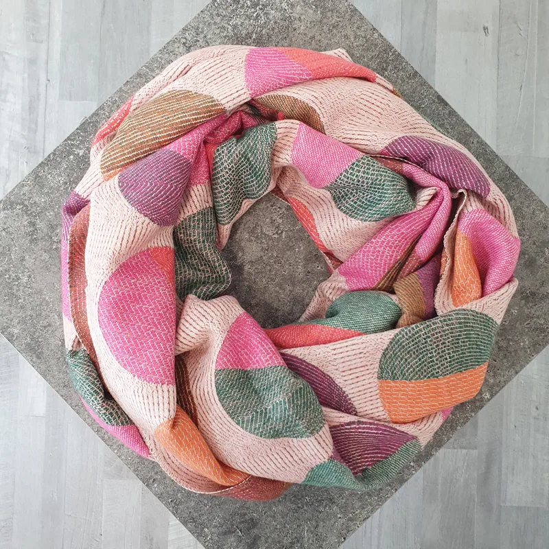 Zimski šal s pisanim vzorcem v bež, roza, zeleni, vijolični barvi. Narejen je iz viskoze in je mehak na otip.