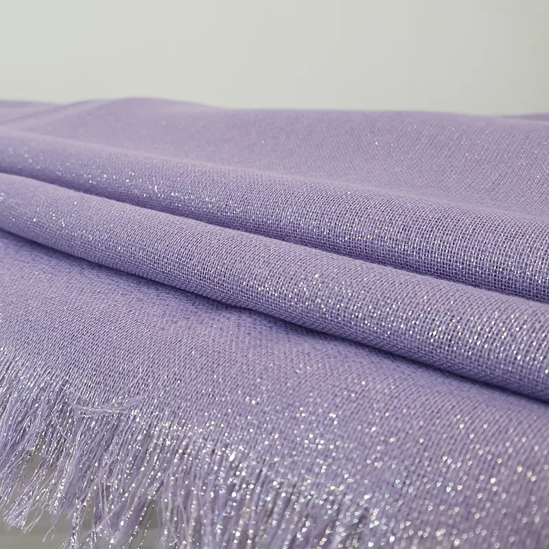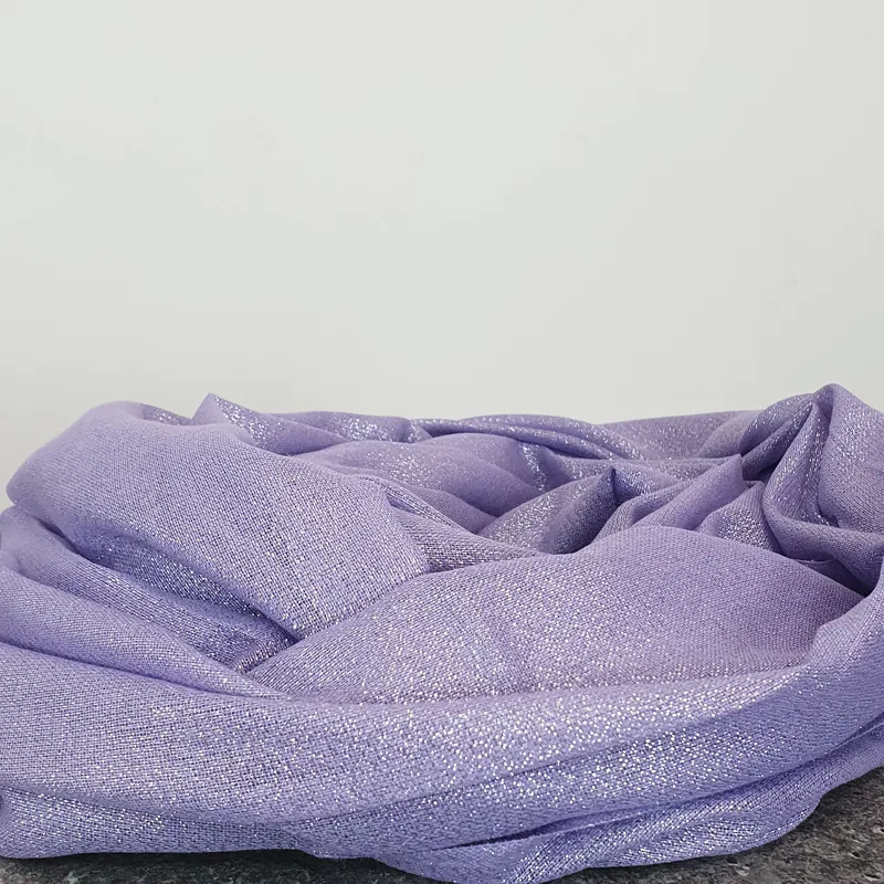 Šal v vijolični barvi, dodana je vijolična nit, da se šal posveti. Narejen je iz viskoze in je mehak na otip.